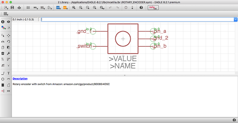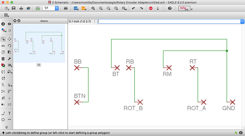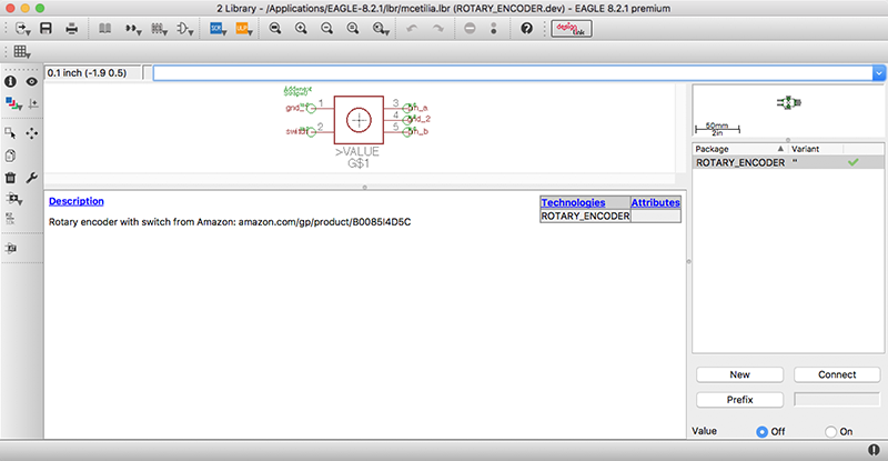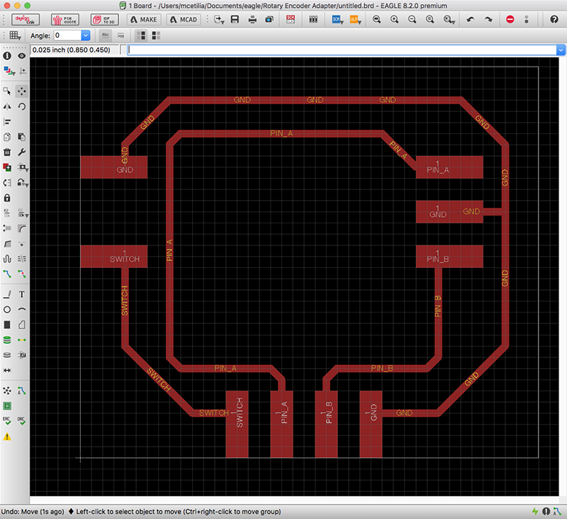 This week, I focused on getting an endless rotary encoder (ordered from Amazon) working with the AtTiny84. To do this, I constructed a breakout board using EAGLE, and programmed the AtTiny84 using the Arduino IDE.