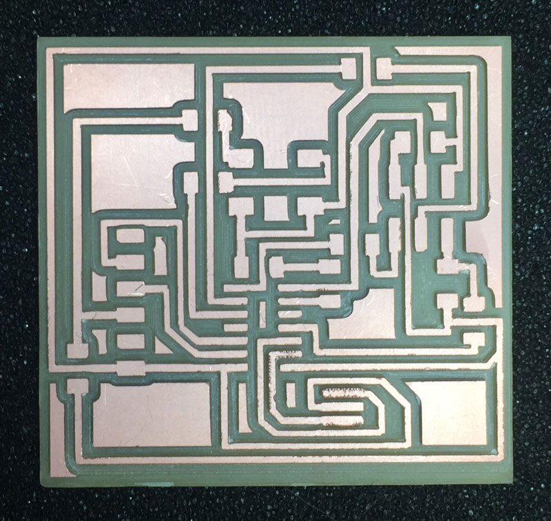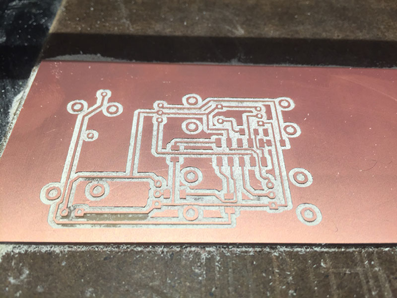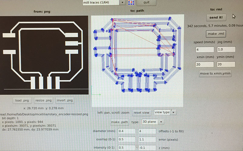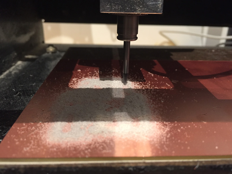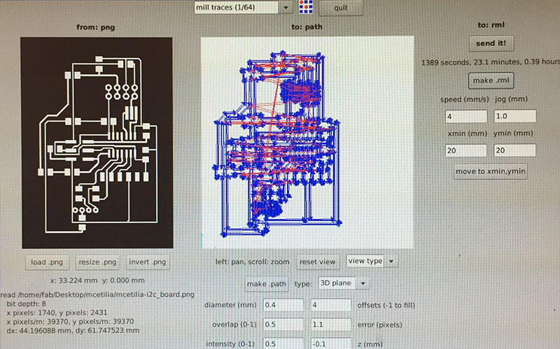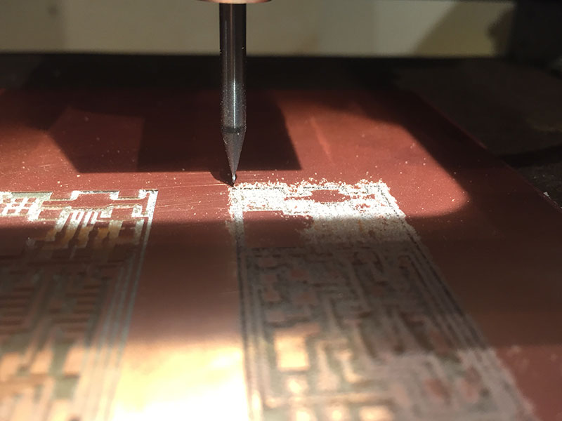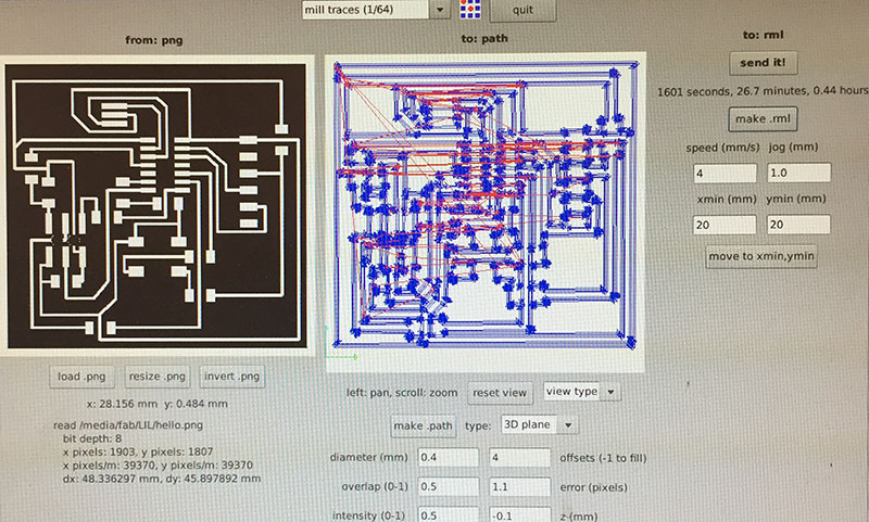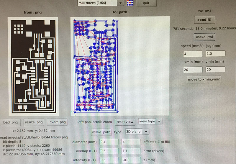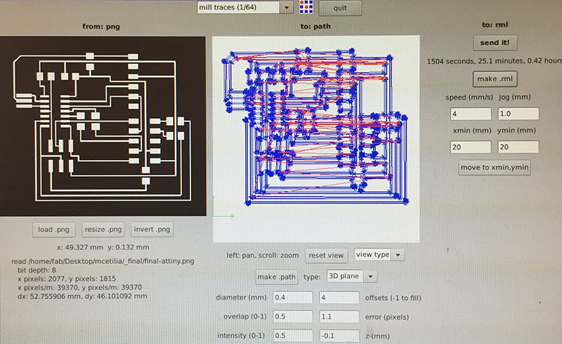 For milling the traces, I used the Fab Modules’ “mill traces (1/64)” settings (diameter = 0.4mm, offsets = 4, overlap = 0.5, error = 1.1, intensity = 0.5, z = -0.1 mm, speed = 4mm/s, jog = 1.0mm) and a 1/64" end mill.