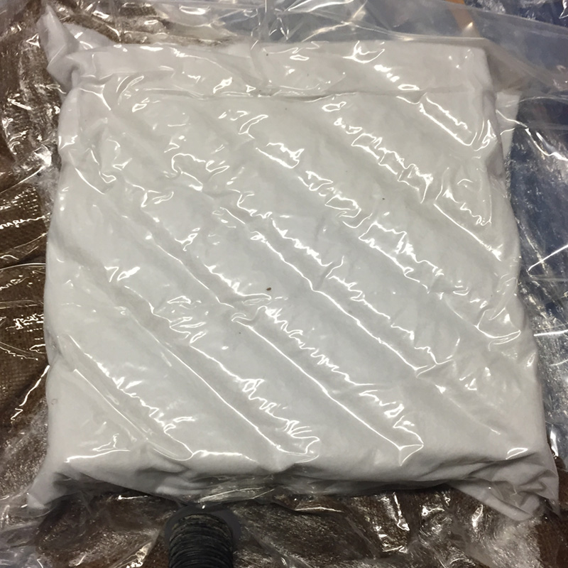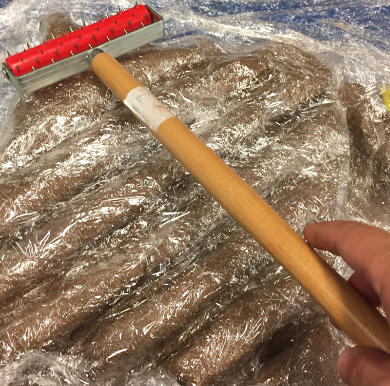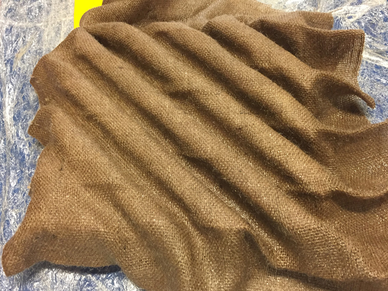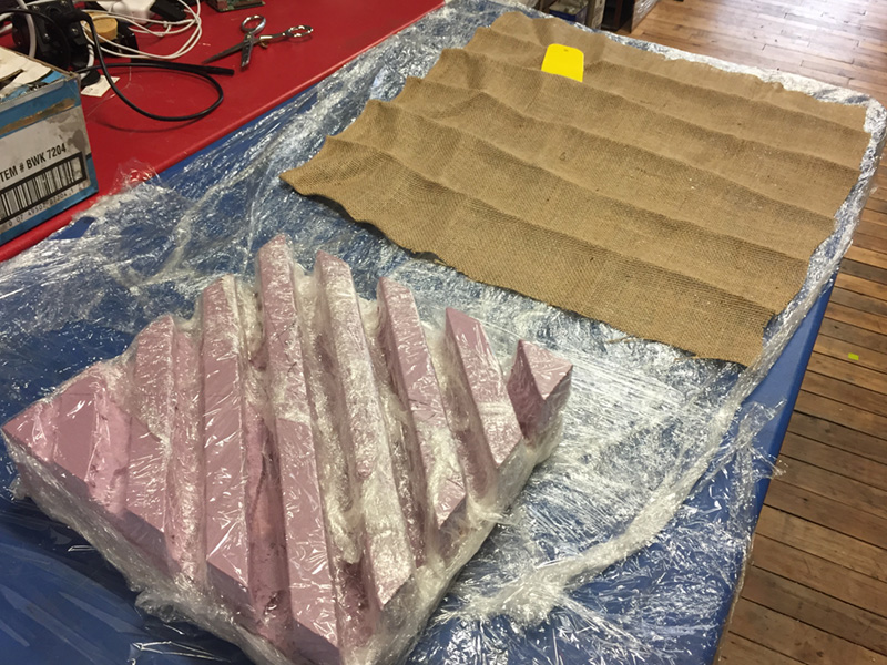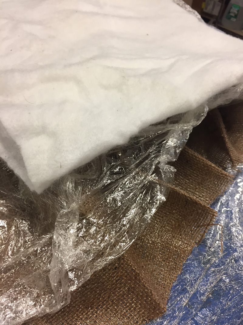 The burlap was then formed to the surface of the foam and another layer of plastic applied to act as a release agent for the other side of the piece. Once this layer of plastic was in place, I poked a number of holes into the plastic and added batting above the plastic to allow the excess resin to seep into the batting, placed everything in a vacuum bag, sealed the bag shut and vacuumed all the air out of the bag.