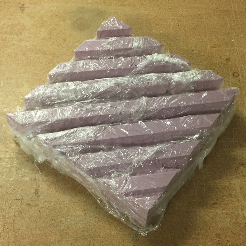 For this week's assignment, I made a mold for acoustic tiling out of machinable foam using Rhino, the ShopBot and PartWorks 3D. In terms of the workflow for the big CNC, I used carpet tape to laminate two sheets of 1-inch polystyrene foam and to fixture it to the bed. As in Week 7, I used the zero plate method to ensure that the height on the Z axis was correct. However, instead of setting the zero positions for X and Y axes to the top right side of the bed, I set the zero to the center of the bed, and placed my foam in the center of the bed. This is much easier for 3D cutting (especially if doing 2- or 4-sided 3D, which I plan to experiment with in the future).