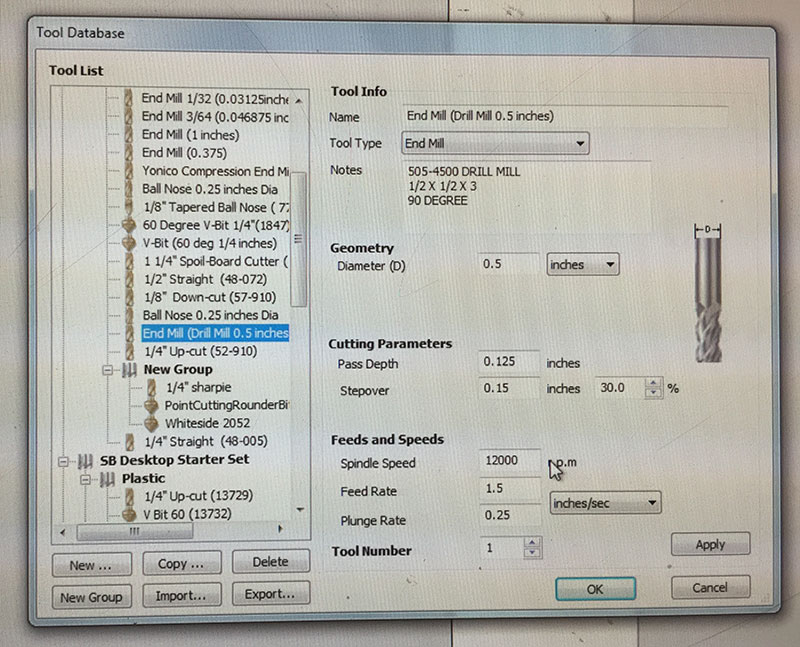 I used VCarve Pro to generate the toolpaths for the Shopbot, with the “1/2" End Mill (Drill Mill 0.5 inches)” setting with a Spindle Speed of 1200rpm, Feed rate of 1.5 inches/sec, and Plunge Rate of 0.25 inches/sec, in conjunction with a 1/2" end mill.