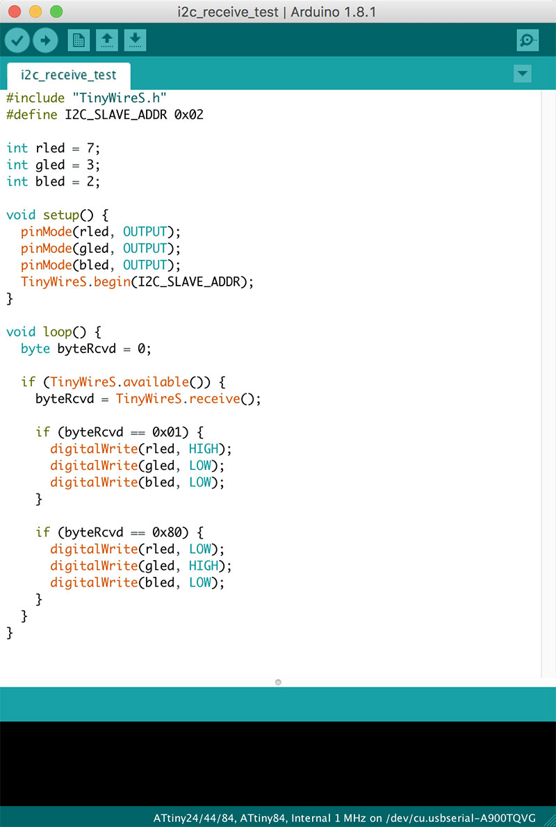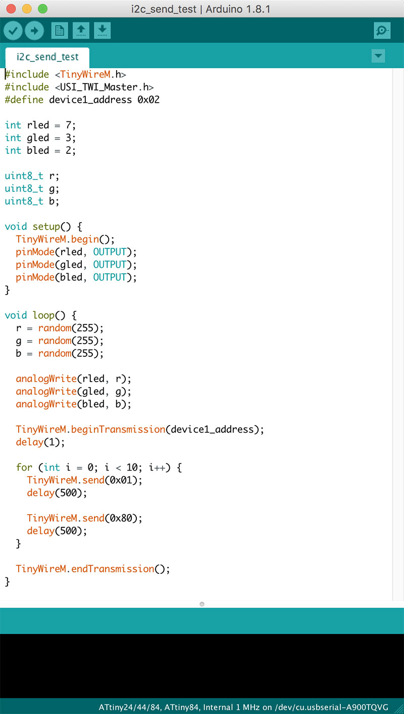 This board was programmed, as in all of my assignments, using the Arduino IDE. While I am disappointed that I was unable to get I2C running on the AtTiny84, I look forward to working with the protocol on other microcontrollers that feature hardware I2C.