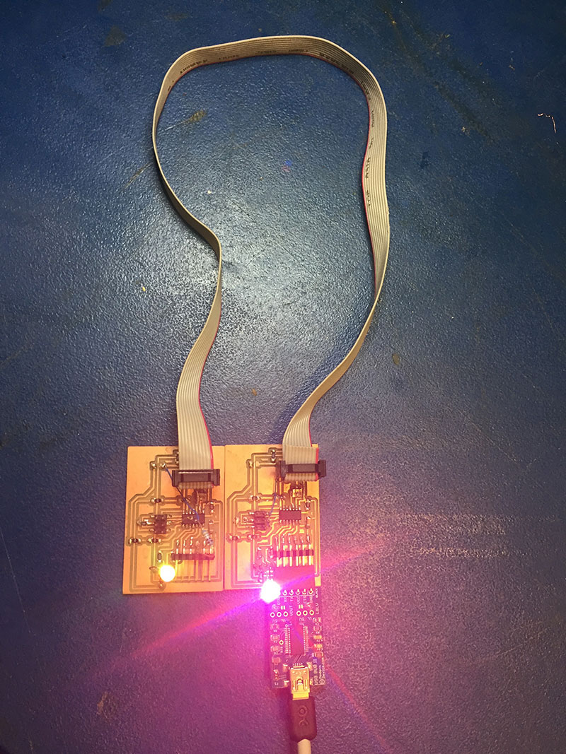 The code I ended up with on the sender boils down to two primary events: setting three pins on the sender to random values between 0 and 255; these pins correspond to the red, green, and blue channels of the RGB LED. This works perfectly (on both boards), as shown in the picture below; this picture also details the specific means of physically connecting the boards using 6-pin IDC cables.