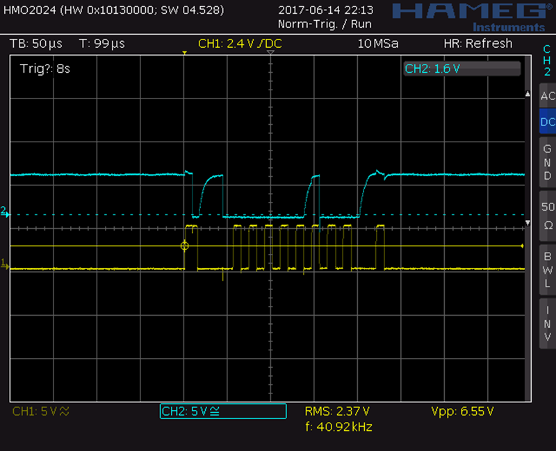 Using TinyWireM, the AtTiny84 than proceeds to begin a transmission. In order to create an event that should be easy to recognize on the oscilloscope, I then had the TinyWireM send a value of 0x01, delay for 500 milliseconds, send a value of 0x80, delay another 500 milliseconds, then repeat 9 more times. After sending this date, the transmission is terminated using TinyWireM’s endTransmission() method.