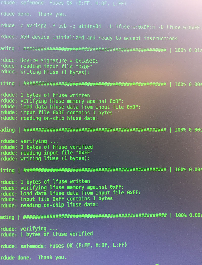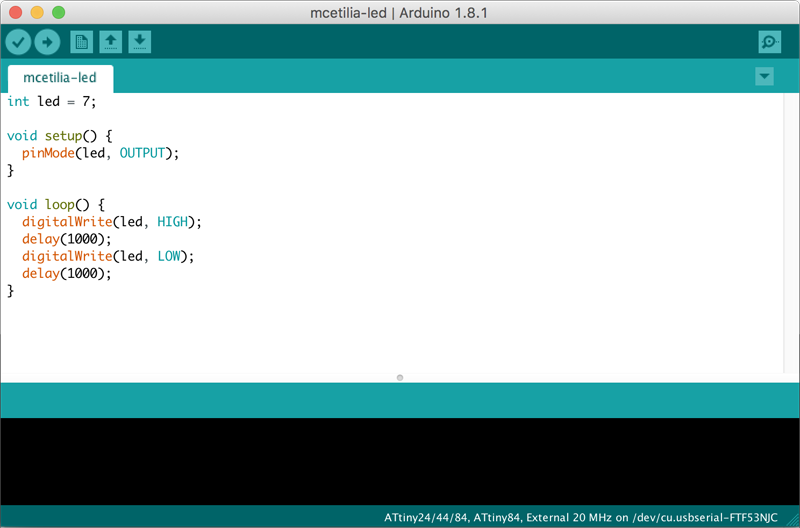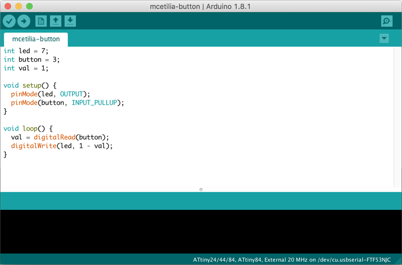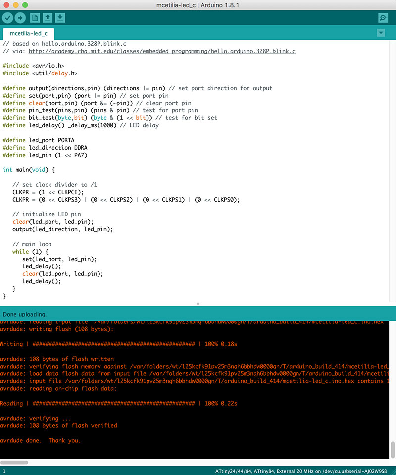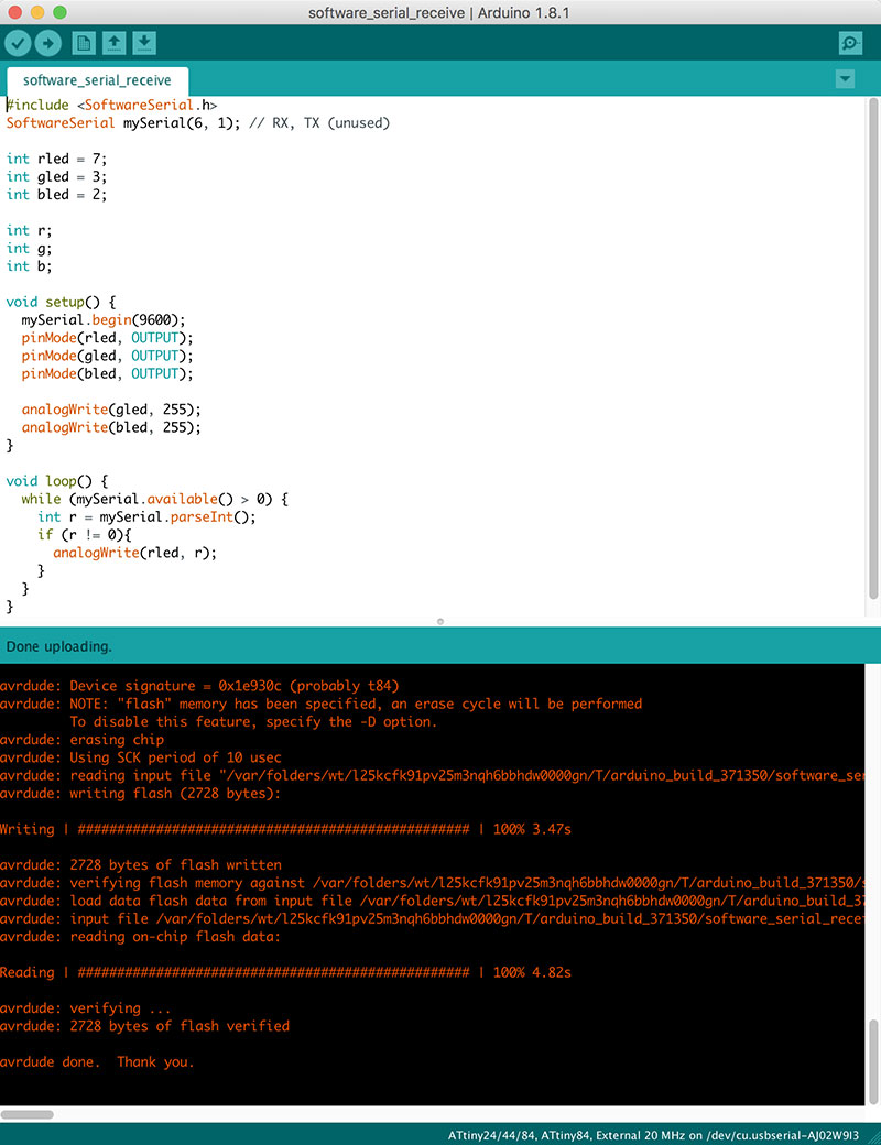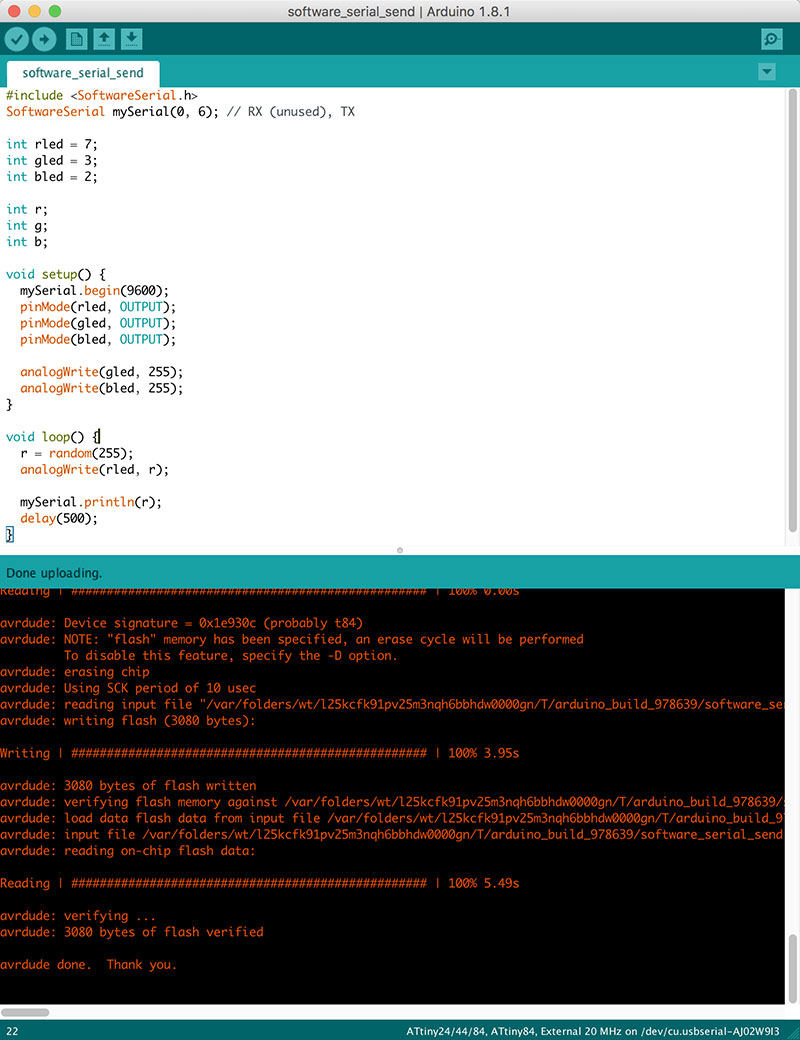 In order to program the AtTiny with the code above, I used the “Upload” button within the Arduino IDE, making sure that the following settings were established under the “Tools” menu: Board: "AtTiny24/44/84", Processor: "AtTiny84", Clock: "External 20 MHz", Programmer: "USBTinyISP".