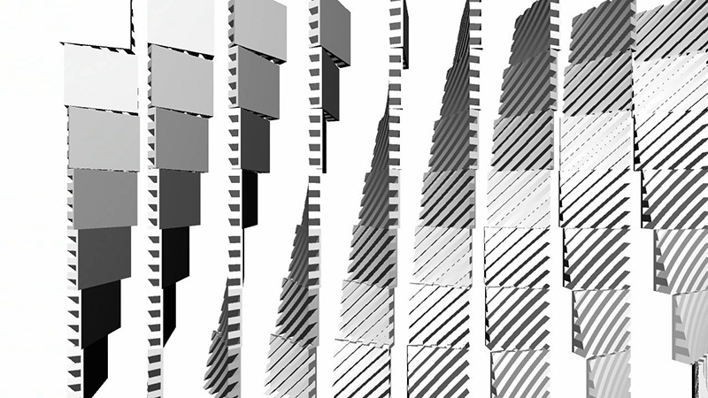 Each of the 3D models in the multidimensional array is positioned on the screen using the translate() function, and by default (i.e. if the switch is not depressed), rotated at a rate based on its position on both axes. This rate is determined by multiplying its position on the x axis by its position on the y axis, and then adding 1, to ensure that all of the models are moving. By this logic, the speed of rotation gets faster along a diagonal axis, with the slowest-moving model found at the far top left end of the screen, and the fastest moving found at the fart bottom right end of the screen.
