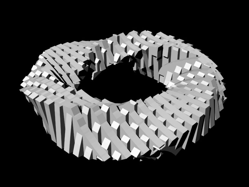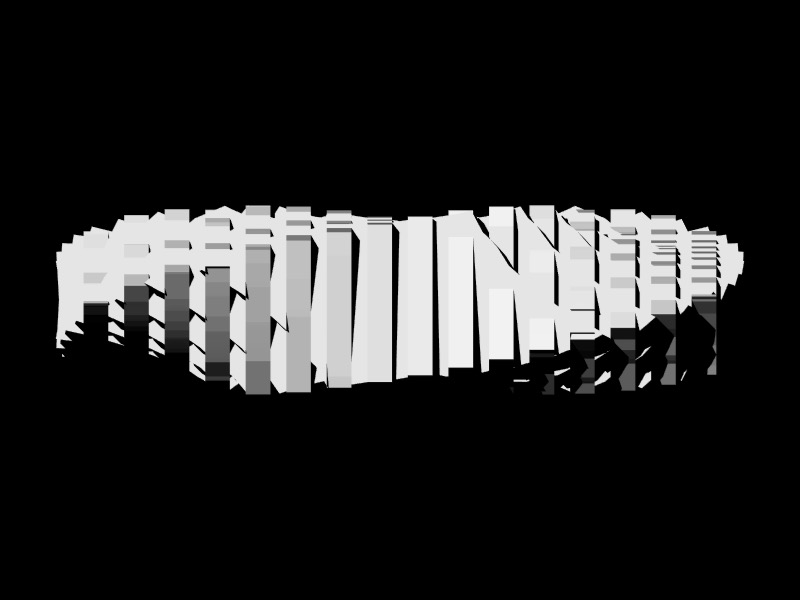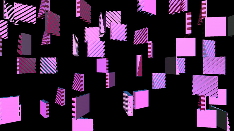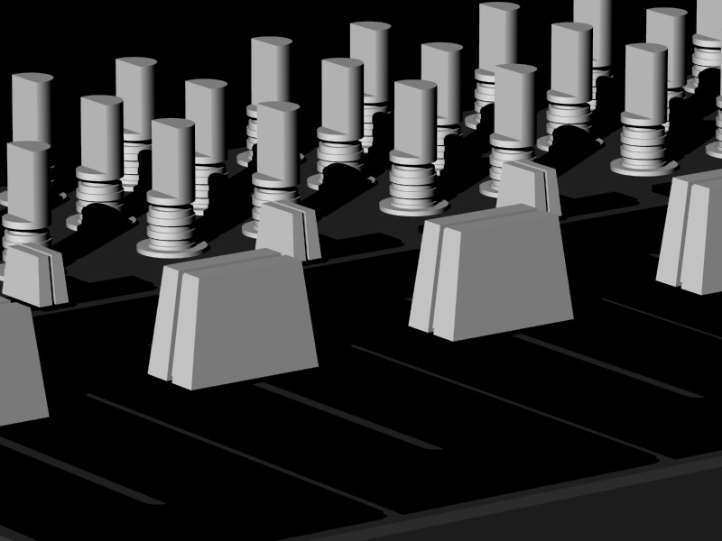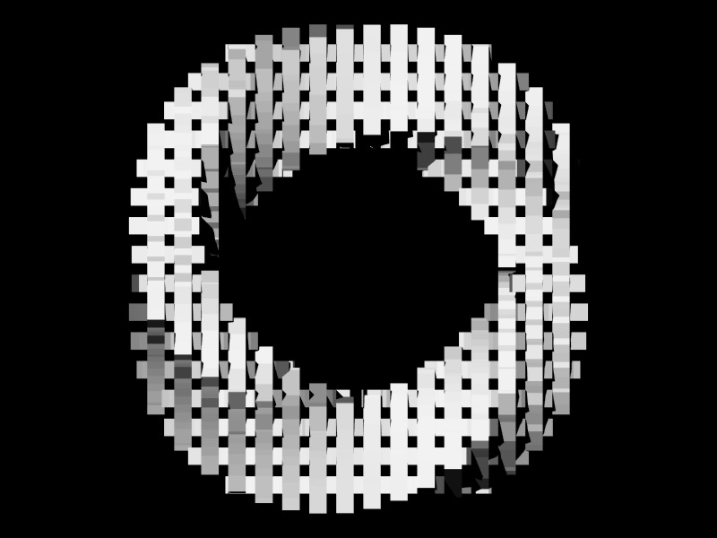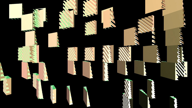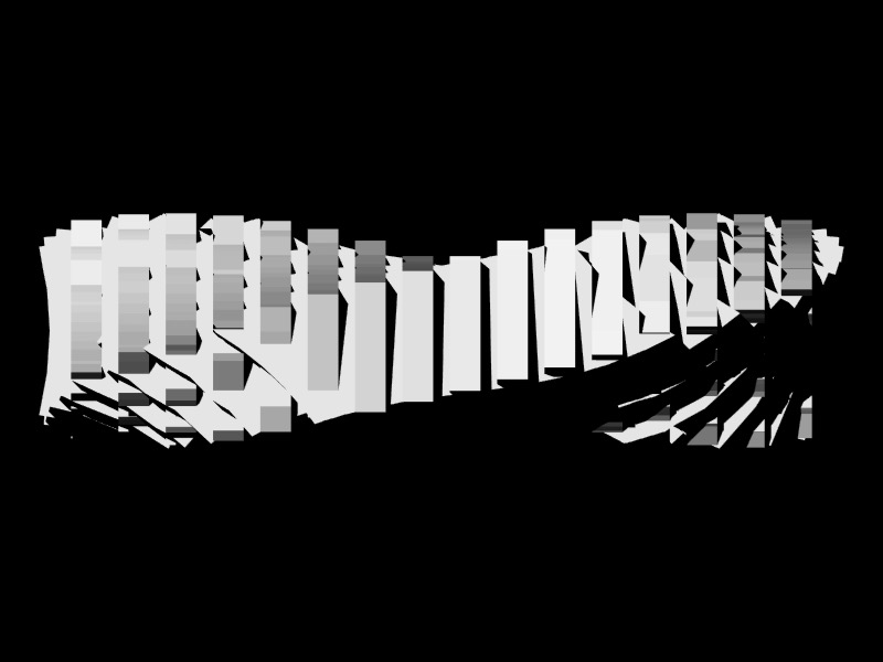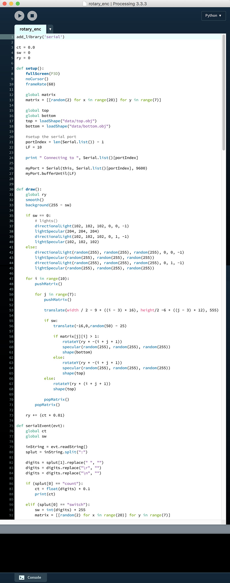 If the switch is depressed, each model moves to the left slightly, and may jump forward or backward up to 25 units per frame. If the random number associated with the position of a 3D model in the matrix is greater than 1, the model will rotate counterclockwise, the specular color of the object will be reassigned every frame, and the 3D model used will be the "bottom.obj" file; if it is less than 0, the model will (also) rotate counterclockwise and the specular color of the object will be reassigned every frame, but the 3D model used will be the "top.obj" file.
