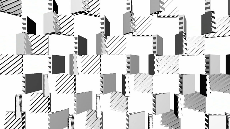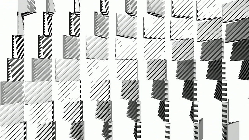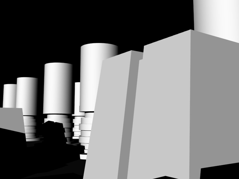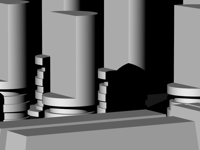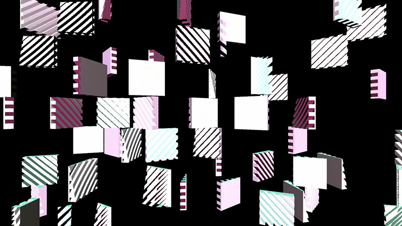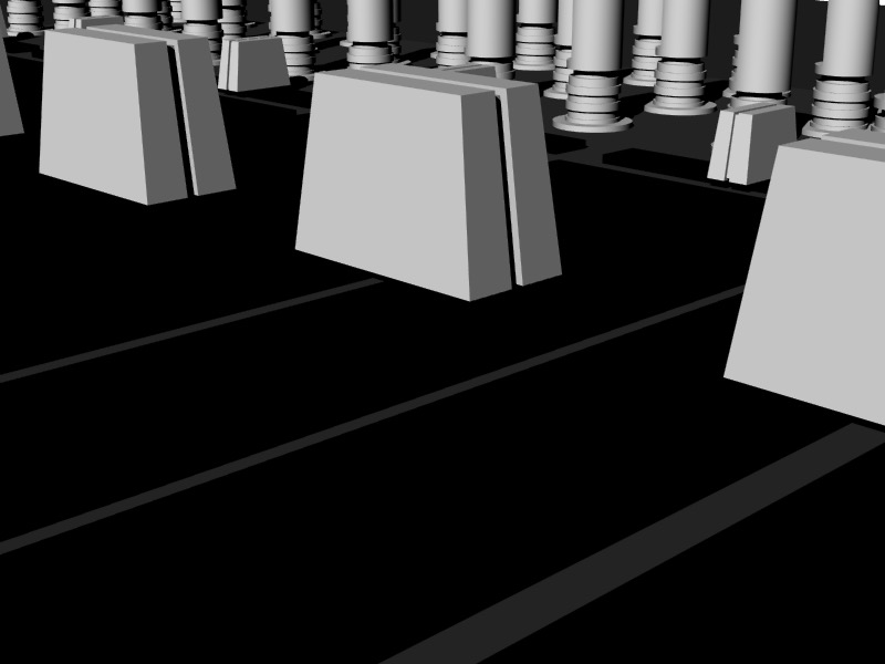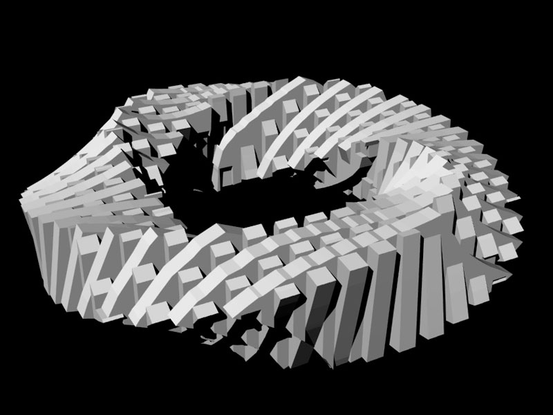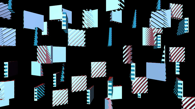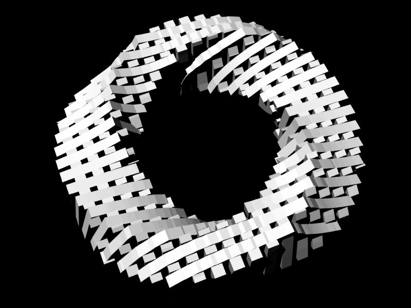 If the switch is depressed, each model moves to the left slightly, and may jump forward or backward up to 25 units per frame. If the random number associated with the position of a 3D model in the matrix is greater than 1, the model will rotate counterclockwise, the specular color of the object will be reassigned every frame, and the 3D model used will be the "bottom.obj" file; if it is less than 0, the model will (also) rotate counterclockwise and the specular color of the object will be reassigned every frame, but the 3D model used will be the "top.obj" file.