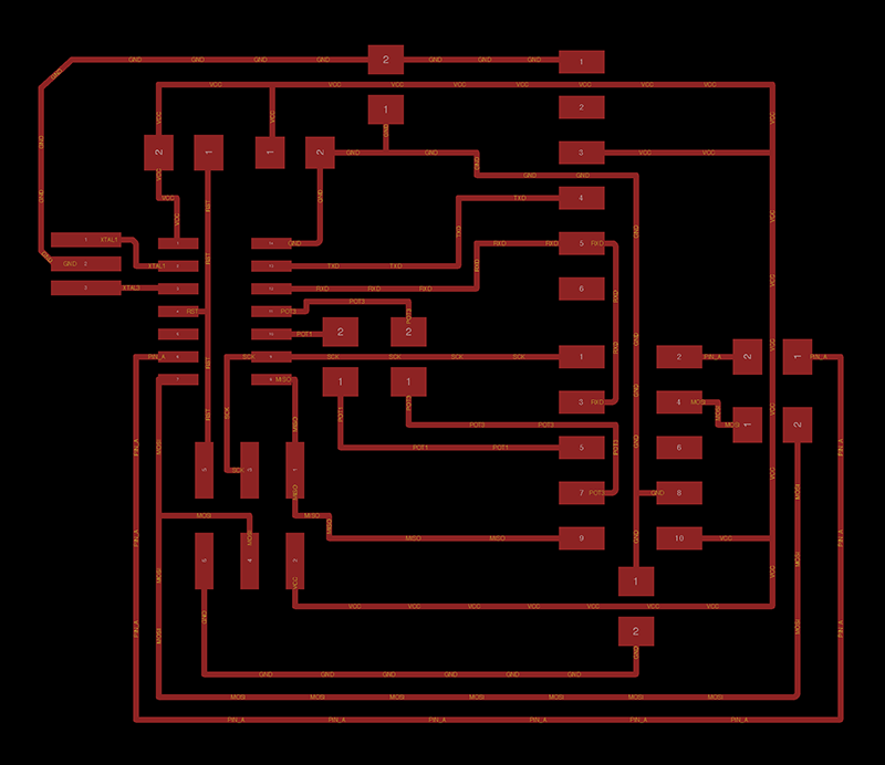 In making this board, I sought to create a reusable board with a minimal footprint that could easily be adapted and folded into other projects (specifically, my final project, as I am planning for it to include a rotary encoder. Given that the AtTiny84 board I made in Week 6 had accessible all the necessary pins via the SCI header (ground and three Analog to Digital Converter pins), I chose to focus on a design that could be reused in multiple scenarios, and for the purposes of this week’s assignment, interfaced via headers and jumper cables.