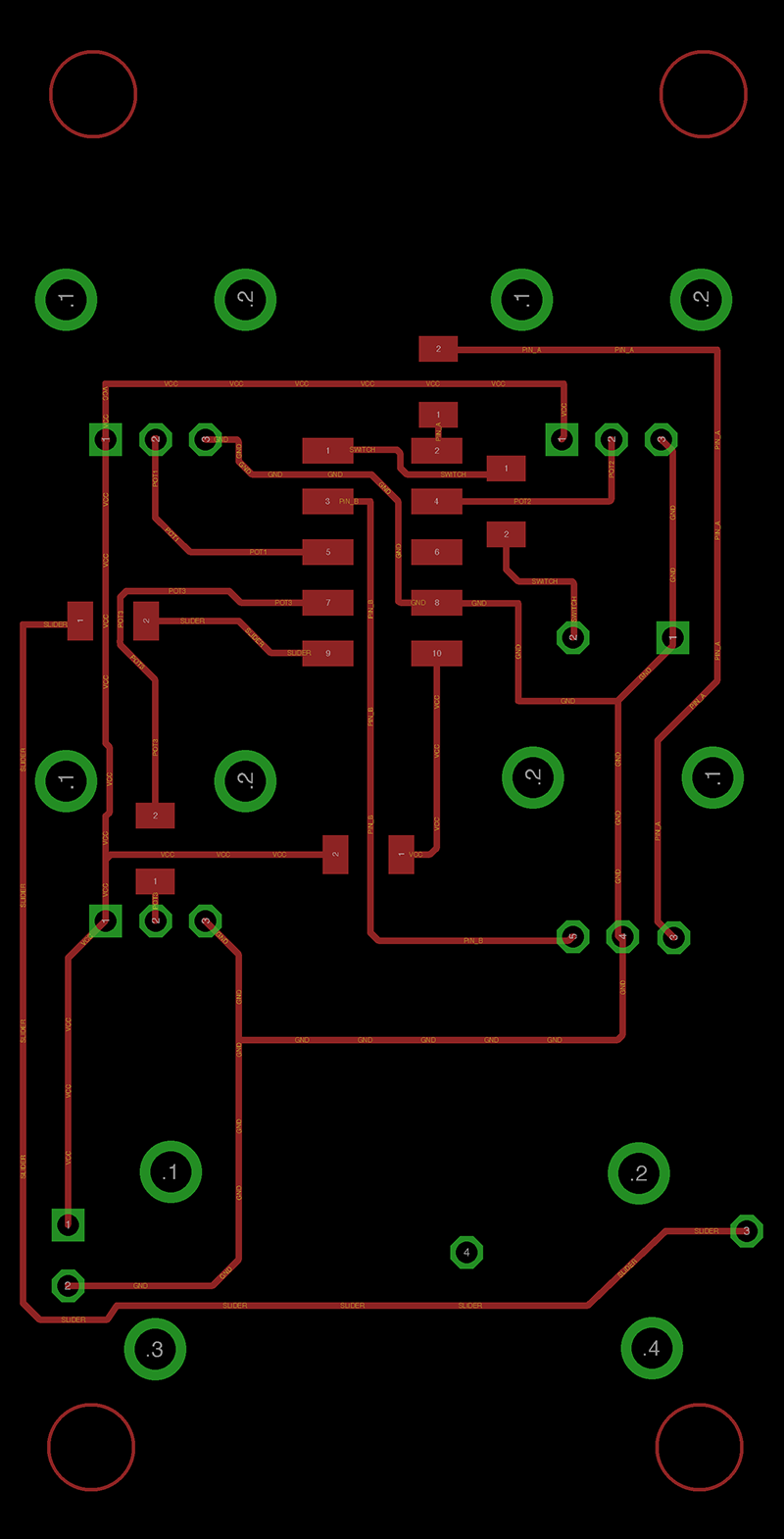 I had initially planned to make one board that would host all eight channels of controls. I now plan to make one board that can be duplicated eight (or more) times, one for each channel. I will begin this process by first refining the schematics and design of the board based on the lessons I learned from this iteration, milling and populating one instance to ensure that I am completely satisfied with the response and tactile sensation of all of the controls. Once this has been accomplished, I will send it out for manufacture by a board house like OSHPark.