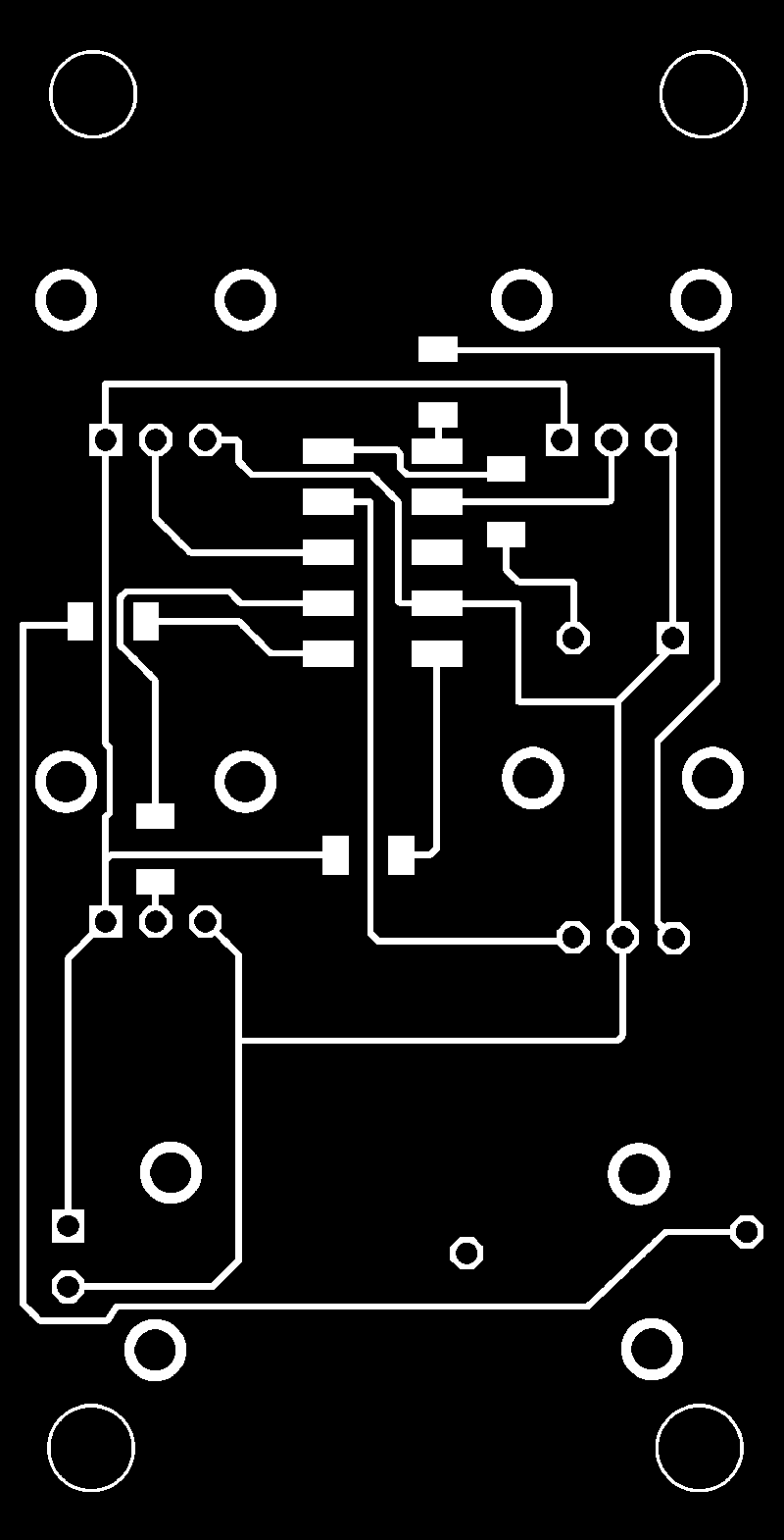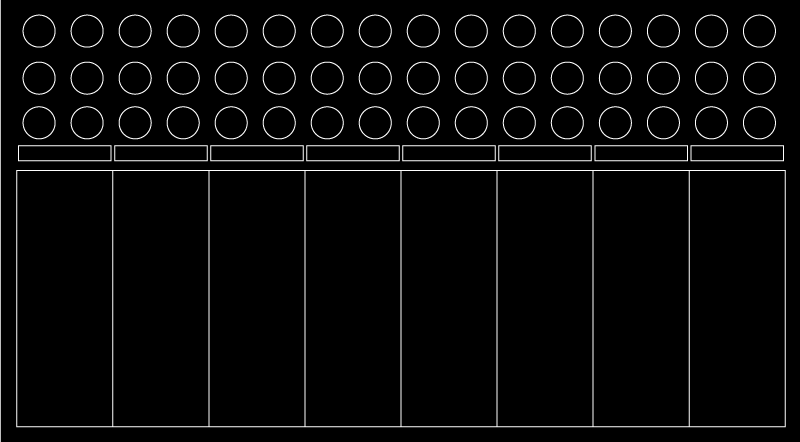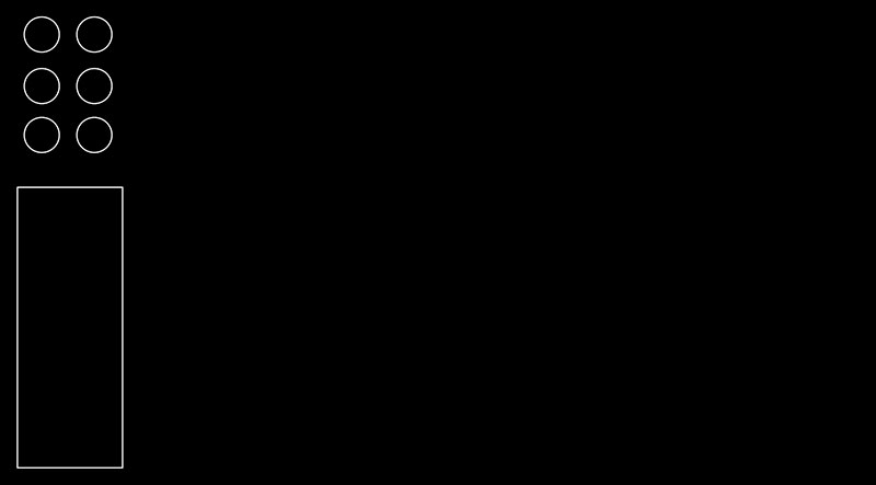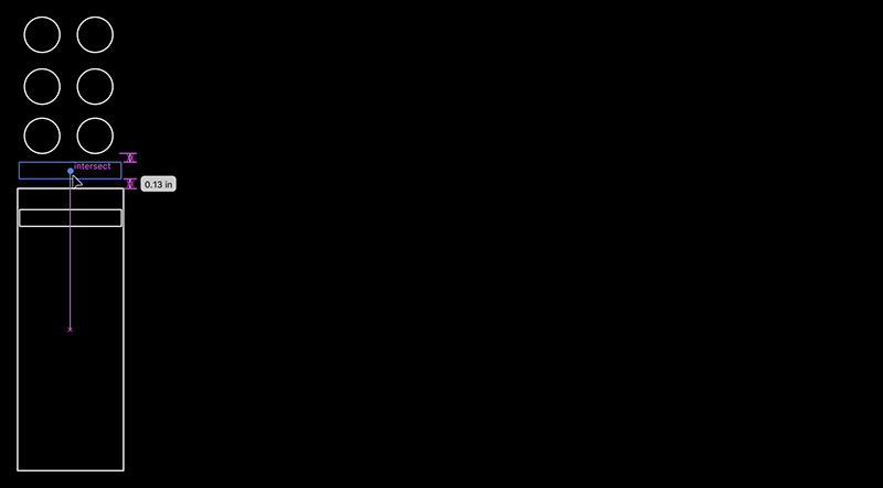 To get started, I first measured the components I will be using, then laid out a rough footprint for a single channel in Illustrator. I began by making three rows and two columns of 0.5" circles, beginning at 0.25" down and 0.25" to the right of the top left corner of the page, and spaced 0.25" apart on each axis, to represent six potentiometers.