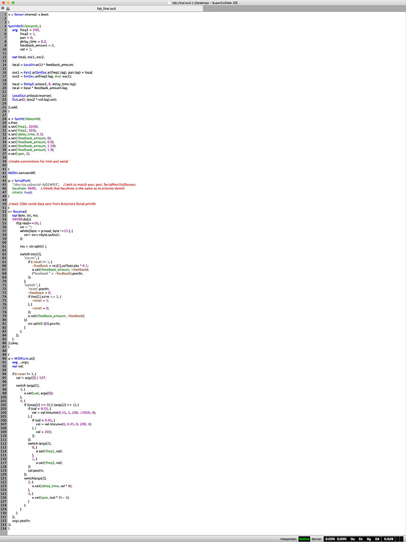 I also developed a preliminary version of the synthesis engine to be used for my final project using SuperCollider running on my laptop in conjunction with the endless rotary encoder / AtTiny84 board from Week 14 and a Korg Nanokontrol 2.