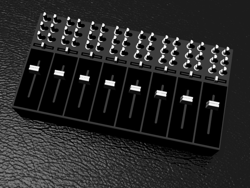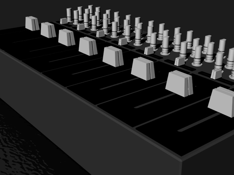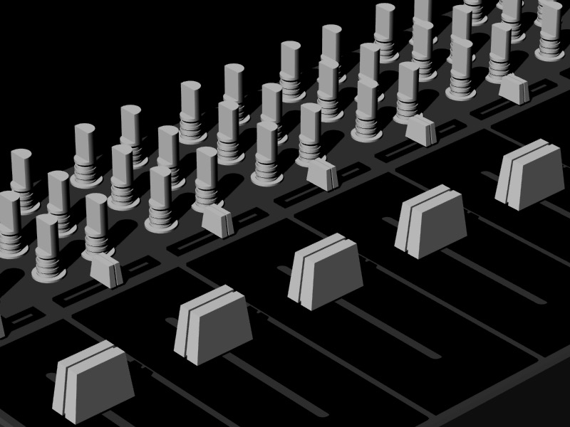 Next, I duplicated and resized the knob from the vertical fader for use in the horizontal slider, and scaled it accordingly. I then made a faceplate for the horizontal slider using the BooleanDifference Tool on two Box objects.