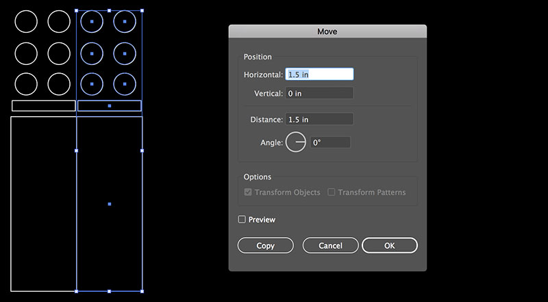 I then grouped all of these objects, and copied the group, using the Paste in Front command (Edit -> Paste in Front), and the Move command (Object -> Transform -> Move) to duplicate the group and move it along the x-axis 1.5 inches eight times.