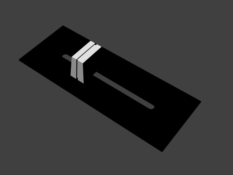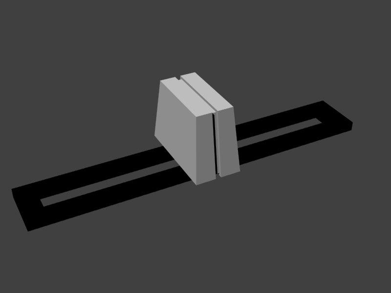 I then created the knob for the vertical fader, first creating a box roughly half the desired depth of the knob’ (but at the desired width and height), then selecting the extrusion edges at the top of the box and bringing them in towards the center of the object, thus creating a trapezoidal solid. I then duplicated and mirrored this form across the z-axis in the Front view using the Mirror Tool (under Transform -> Move), then moved the mirrored sides slightly apart, added a rectangular solid between them, and used Rhino’s BooleanUnion Tool to combine the resulting forms. Next, I made the cutout area of the faceplate for the fader by creating two cylinders and a rectangular solid, which I combined to make one object using the BooleanUnion Tool. I then made the faceplate itself using the Box Tool, and used the BooleanDifference Tool to remove the cutout area from the faceplate.