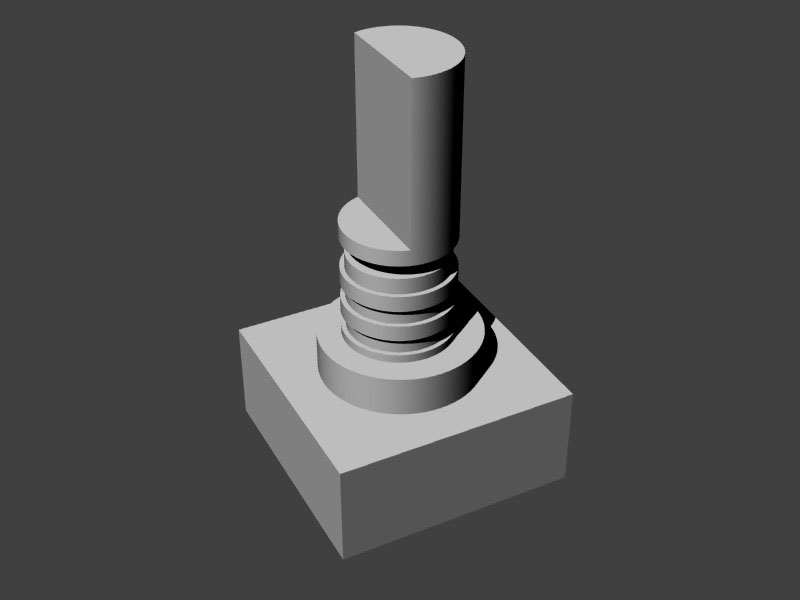 Having determined the dimensions and spacing in Illustrator, I began rendering each of the components to scale in Rhino. To start, I took on the D-shaft potentiometer. This is a fairly simple shape, which I created by combining a series of cylindrical forms for the base, ridges, and shaft, with a box at the dimensions of the actual potentiometer&rsquot;s footprint. To create the D-style shaft, I simply made a box, aligned it with the shaft, and used Rhino’s BooleanDifference Tool (under Transform).