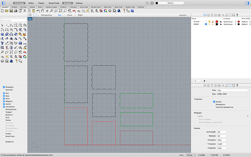 All parameters are made available to the user through GUI elements, and may be changed dynamically at any point, allowing for quick changes to be made based on materials and the laser cutter used, as well as easy experimentation in finding the perfect “Fudge Amount” values to ensure perfect press fit connections.