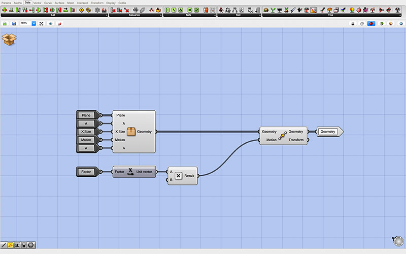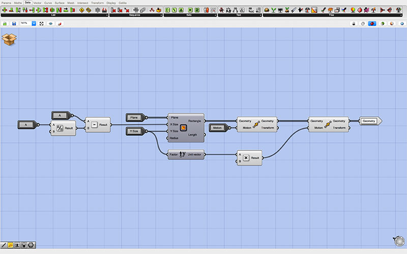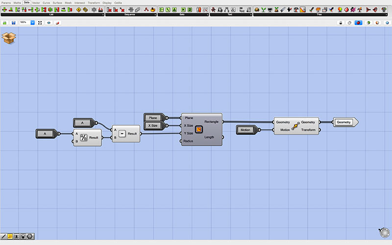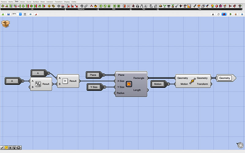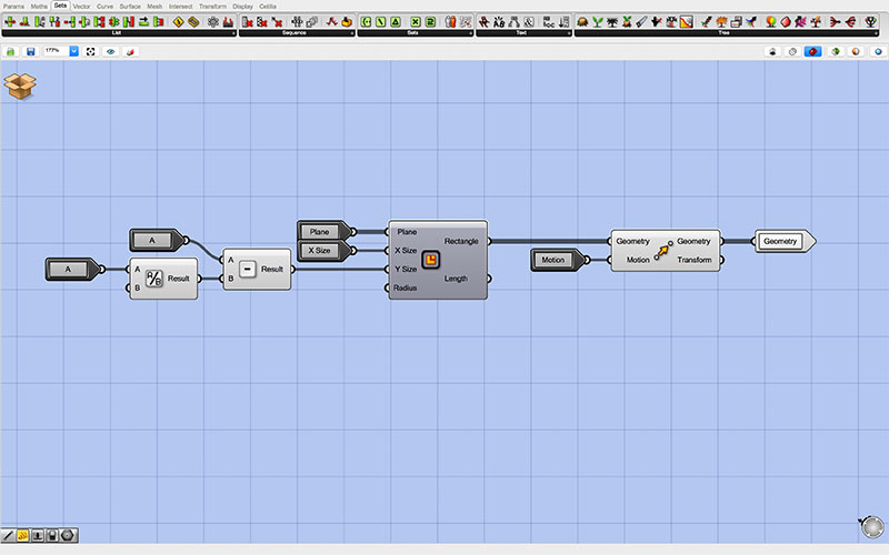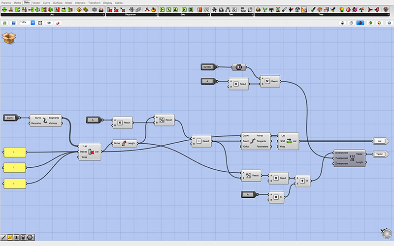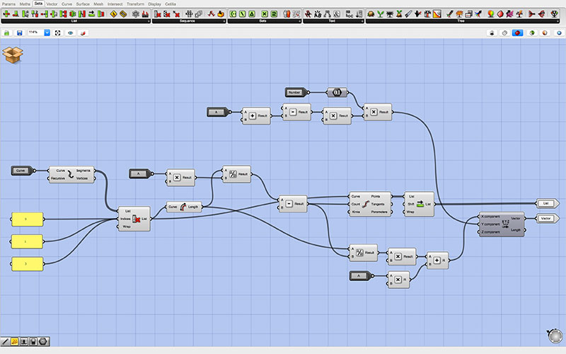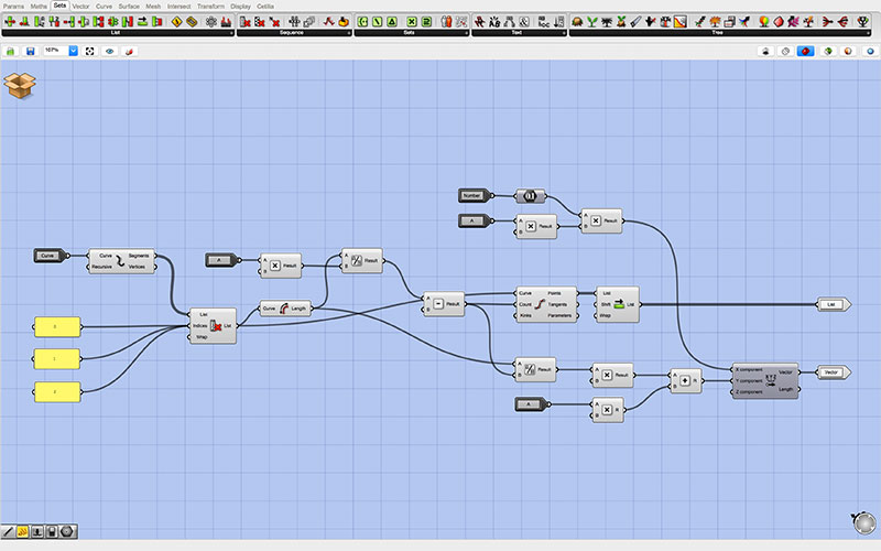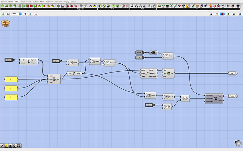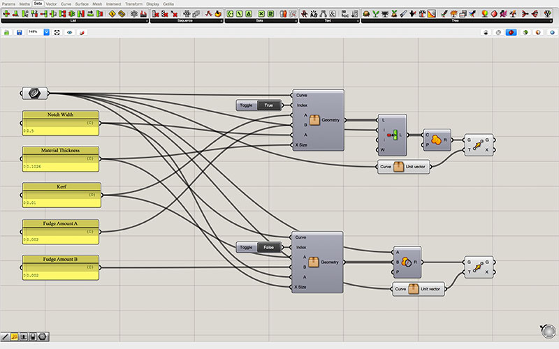 At the root of my Grasshopper script are the controls which are passed to each of two identical “clusters.” The top cluster generates the outgoing tabs, while the bottom cluster generates those that are inset into the form (though this may be changed by reversing the toggle with the inlet for each of the adjoining pieces).