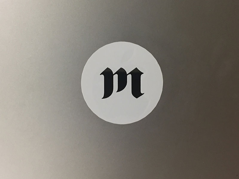 I also vinyl-cut a sticker to cover the Apple logo on my laptop with the letter “m” from my group Mem1’s logo (special thanks to Marco Pinsker for the logo design). The file used consists of a circle, which delineates the outside of the sticker, enclosing the letter “m,” which will be cut out to take advantage of the mirrored surface of the Apple logo beneath for a second “ink.” Neither object was given a fill color, and were outlined using solid red with a 0.5 point weight.