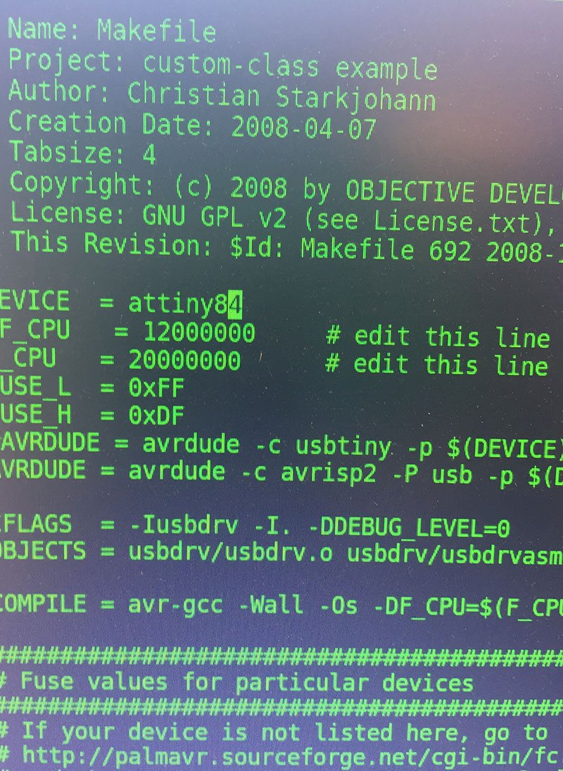 First, I downloaded the firmware from the class site, and edited the Makefile to ensure that it worked with the AtTiny84 chips we are using in our lab.