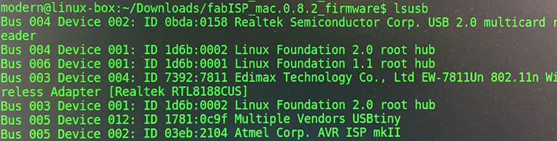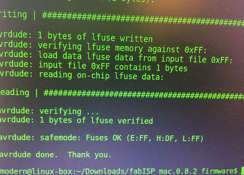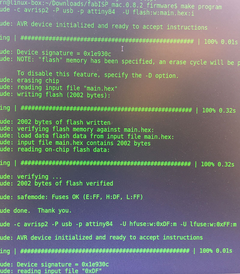 Once I had populated the board, I connected it to the lab’s Linux box both over USB (for power) and via an AVRISP mkII programmer, and began the programming the board.