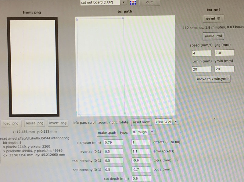 For cutting out the boards, I used the Fab Modules’ “cutout board (1/32)” settings (diameter = 0.79mm, offsets = 1, overlap = 0.5, error = 1.1, top intensity = 0.5, top z = -0.6mm, bot intensity = 0.5, bot z = -1.7mm, cut depth = 0.6mm, speed = 4mm/s, jog = 1.0mm) and a 1/32" end mill.