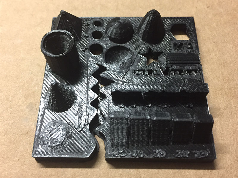 Test your 3D printer! model by ctrlV, which we printed using Cura with a Layer Height of 0.06mm, Shell Wall Thickness of 0.8mm, Shell Top/Bottom Thickness of 0.8mm, Infill Density of 20%, Print Speed of 60mm/s, Travel Speed of 120mm/s, and Material Retraction Enabled, Print Cooling, and Support (placed Everywhere) enabled; the Build Plate Adhesion Type was set to Brim with an 8.0mm Brim Width, and the Print Sequence was set to All at Once. These settings resulted in a fairly decent print, though some details were lost in translation (especially the high peaks of the cone and pyramid shapes). It might be helpful to take it a little slower, and try adjusting the temperature settings for a more accurate print.