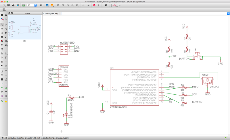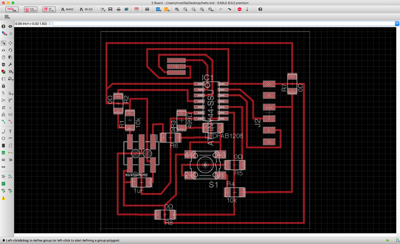 Designed a “hello-ftdi” board in EAGLE, first creating the schematic, based on the Introduction to EAGLE tutorial, including the addition of a button and LED. Once I created the schematic, I then set about arranging the parts & routing the wires in EAGLE’s Board view.