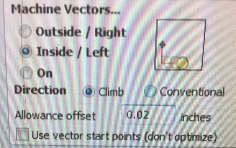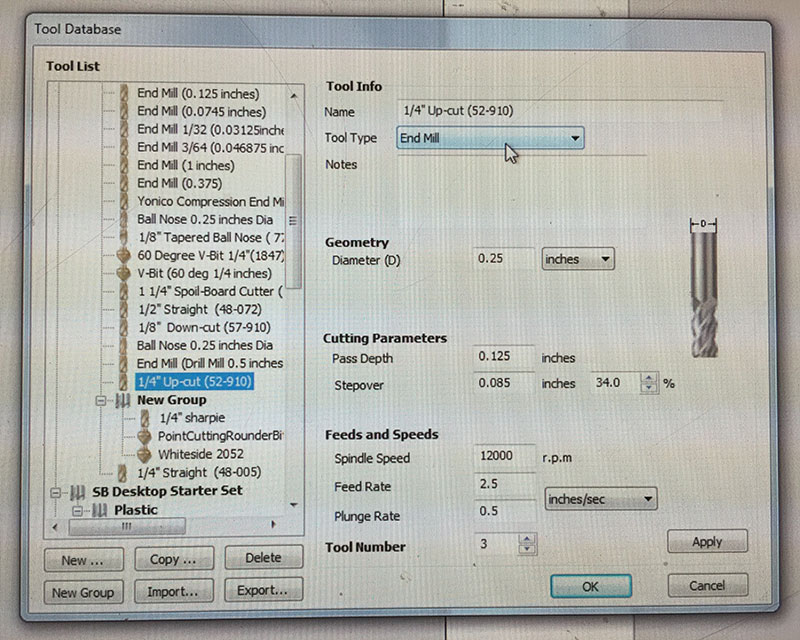 I used VCarve Pro to generate the toolpaths for the Shopbot with the “1/4" Up-cut (52-910)” setting with a Spindle Speed of 1200rpm, Feed rate of 2.5 inches/sec, and Plunge Rate of 0.5 inches/sec, in conjunction with a 1/4" end mill.