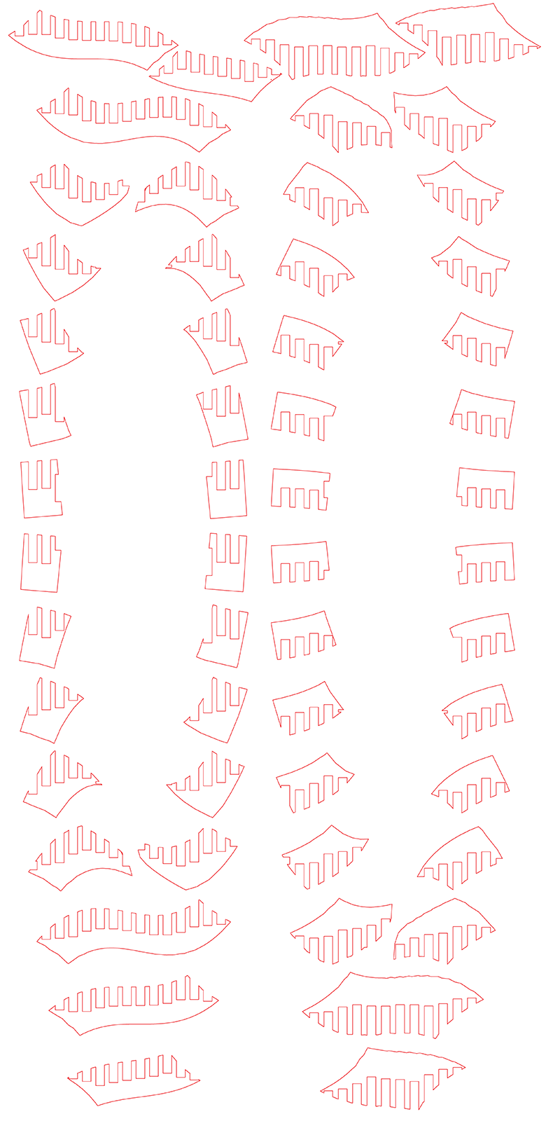 Once I had all the sections positioned on a flat plane, I then baked them and exported the resulting 2D image as an Illustrator file, and opened the file. In Illustrator, I scaled the pieces to fit perfectly on a 4x8' sheet of plywood (rearranging the pieces slightly to make get the most surface area out of the sheet.