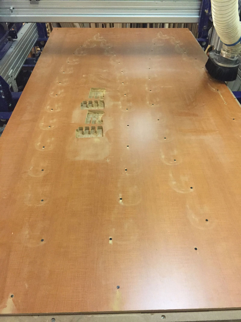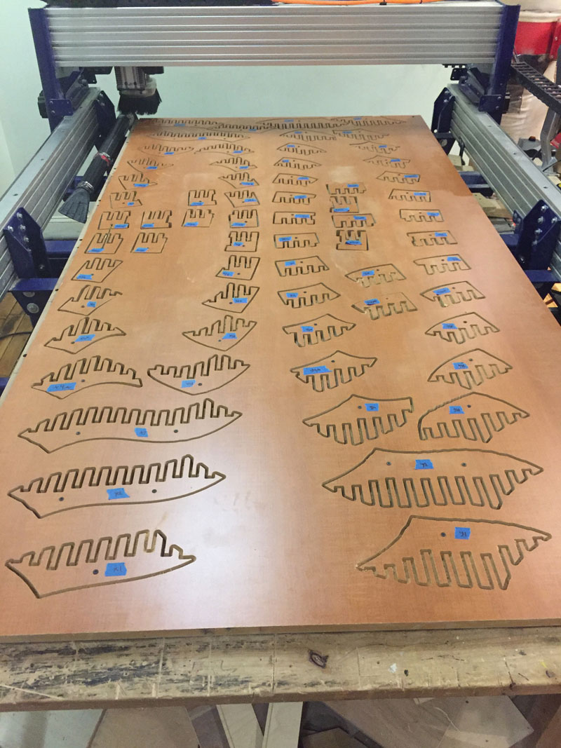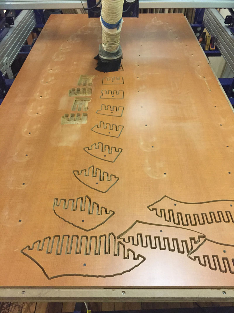 It is worth noting that our Shopbot is “open loop” (i.e. it does not provide any feedback from the axes), so I had to keep an eye on the machine the whole time and re-run a couple of pieces at the end of the job.