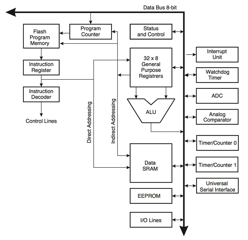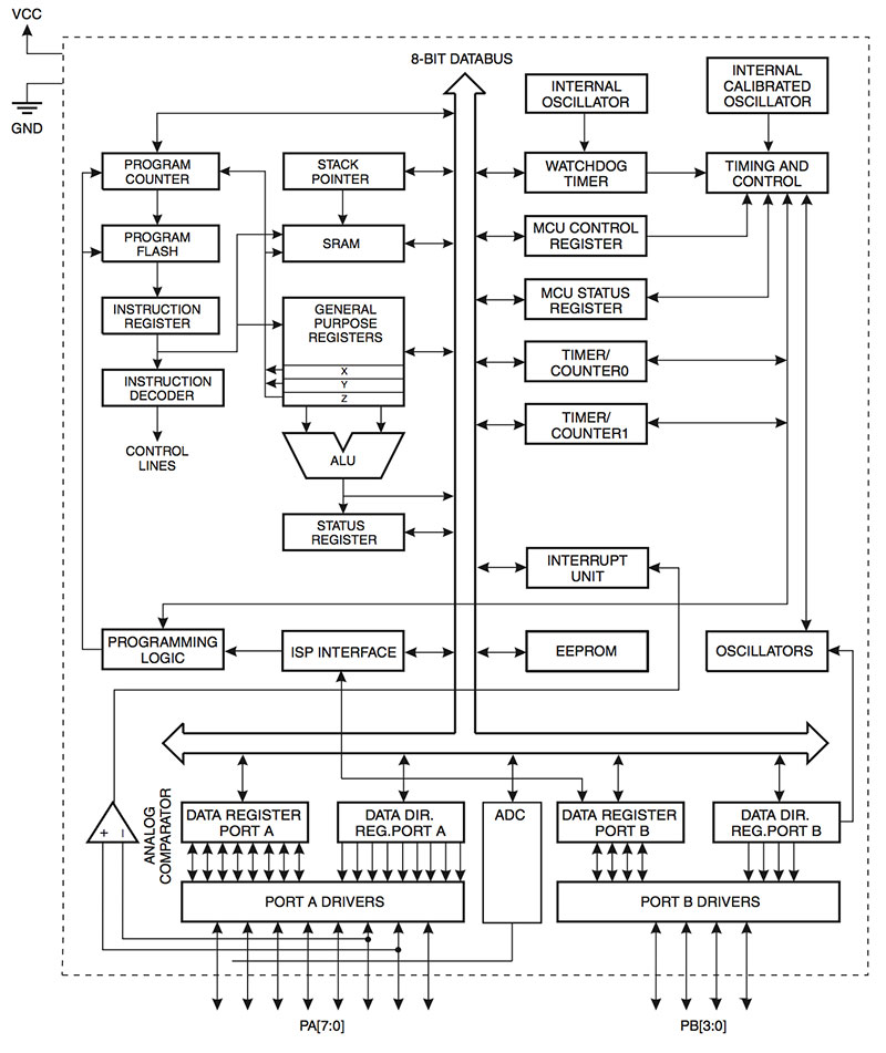 The AVR architecture used in the AtTiny chips is based on a Harvard architecture, which provides “separate memories and buses for program and data,” thus allowing predictable timing due to the fact that each subsequent command is fetched and passed on for execution within a single clock cycle.