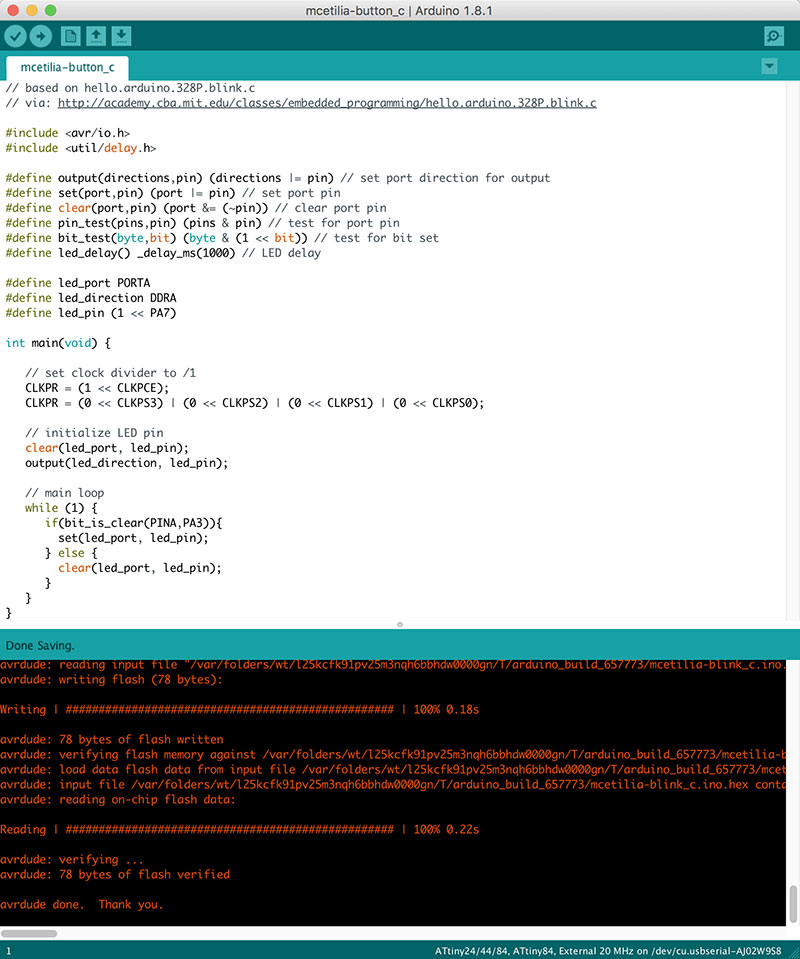 In order to replicate this functionality, I began from Neil’s hello.arduino.328P.blink.c script, and modified it to work with my board, using PORT A rather than PORT B, with pins PA7 (physical pin 6 on the AtTiny84) for the LED and PA3 (physical pin 10 on the AtTiny84) for the button. In order to determine if the button is pressed or not, I use the bit_is_clear function from the avr library.