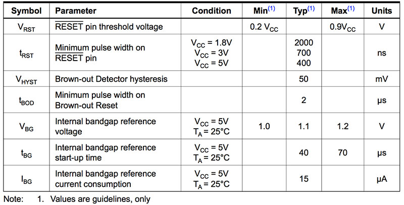 Though there are myriad additional uses for the pins (detailed in the “Alternate Port Functions” section of the data sheet), the final pin I wish to make note of here is physical pin 4 (PB3), which may be used to reset the microcontroller if held high for a period specified by the table above.