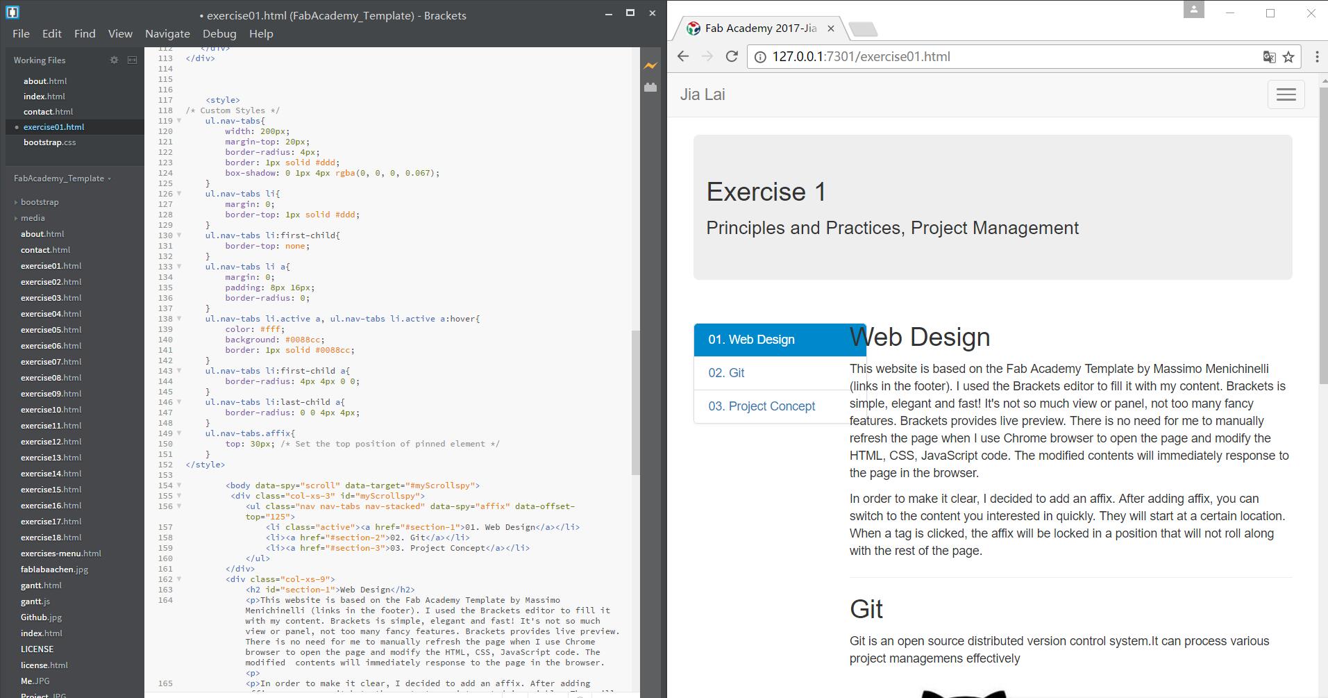 This website is based on the Fab Academy Template by Massimo Menichinelli (links in the footer). I used the Brackets editor to fill it with my content. Brackets is simple, elegant and fast! It's not so much view or panel, not too many fancy features. Brackets provides live preview. There is no need for me to manually refresh the page when I use Chrome browser to open the page and modify the HTML, CSS, JavaScript code. The modified contents will immediately response to the page in the browser.