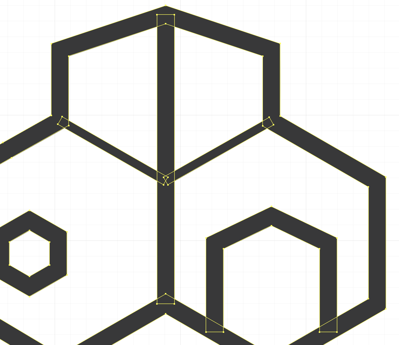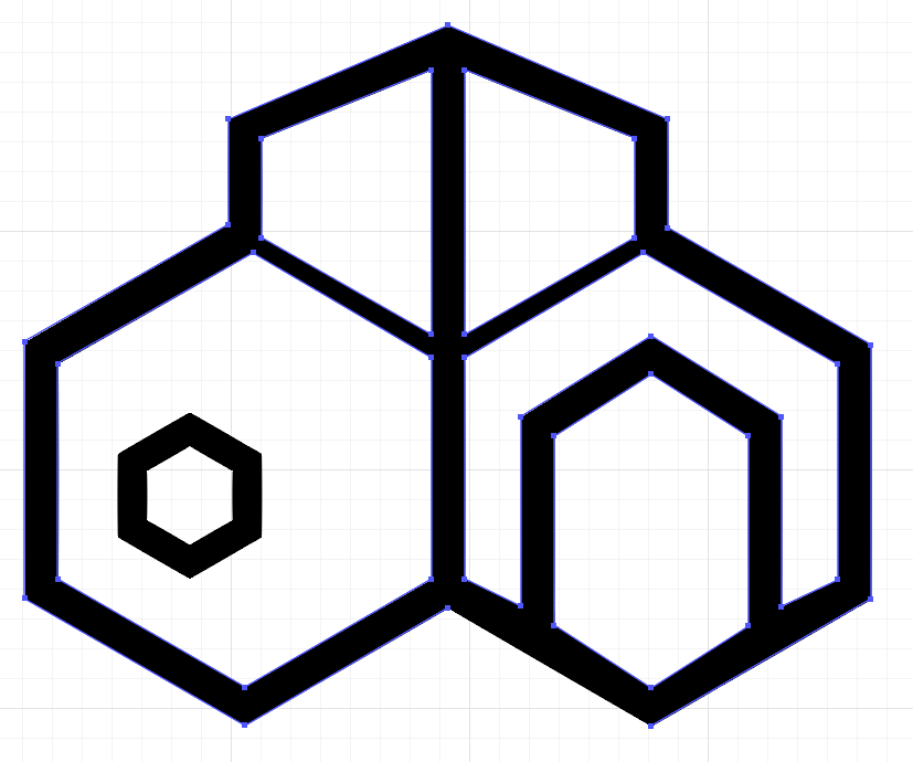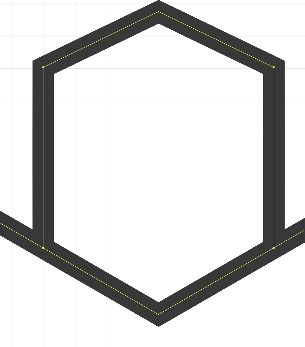 I used hexagons that I merged into the outer outline and added the other shapes (the inner lines and the 'doorway'). I outlined the lines: Path - Outline Stroke. I tweaked the proportion of the top by selecting the top anchor points and moving them all down together with the bottom arrow on the keyboard. I changed the width of the inner diagonal lines by moving their anchor points. Since this moved everything around, I made a new Layer, put the same basic hexagons there, and lined up the anchor points with the background hexagons. I could then hide this layer when I didn't need it. This is a super boring description, but every time I work with Illustrator I find that some steps are better done first and then other steps. So mess and chaos and randomness first and then do the whole darn thing again in a better order.