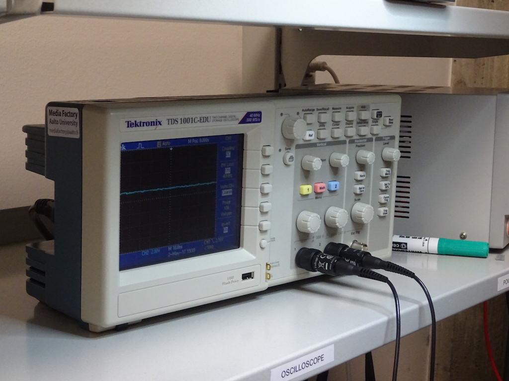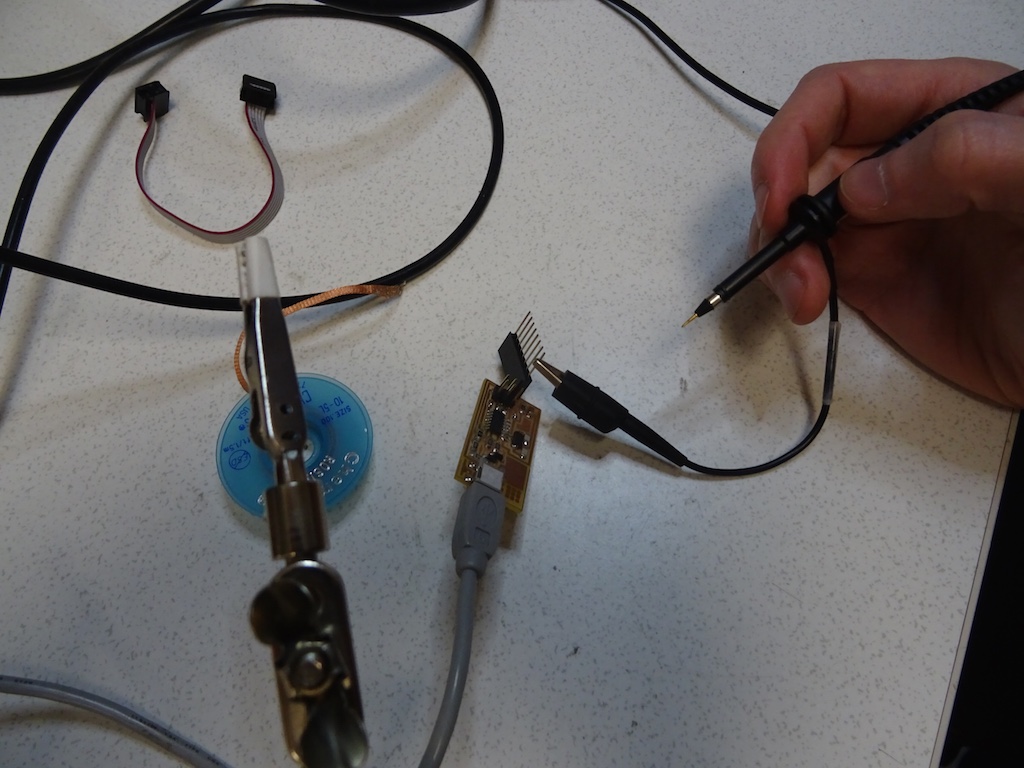 I don't know how to use the oscilloscope and this is not 100% familiar to the others, so three of us gather to try - to test the crystal. GuyNextToMe (his name is Otto) first explains that it cannot be used like a multimeter where you can put the pins (what are they called?) anywhere - ground needs to go to ground. He attaches the ground clip of the oscillator to the ground pin.
