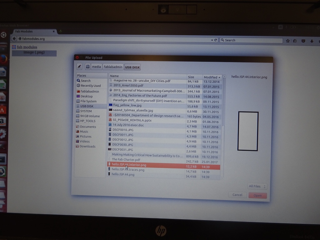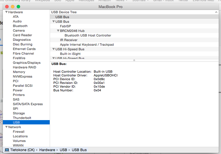 But when we check to see if the laptop recognizes it, the FabISP does not appear in the Hub menu. Maybe it's a problem with the USB cable, so we try another one that I know works - still nothing. We try in my other laptop, not there either. Niklas wonders if it is a problem with that programmer so we switch to the other one and try the whole procedure again.