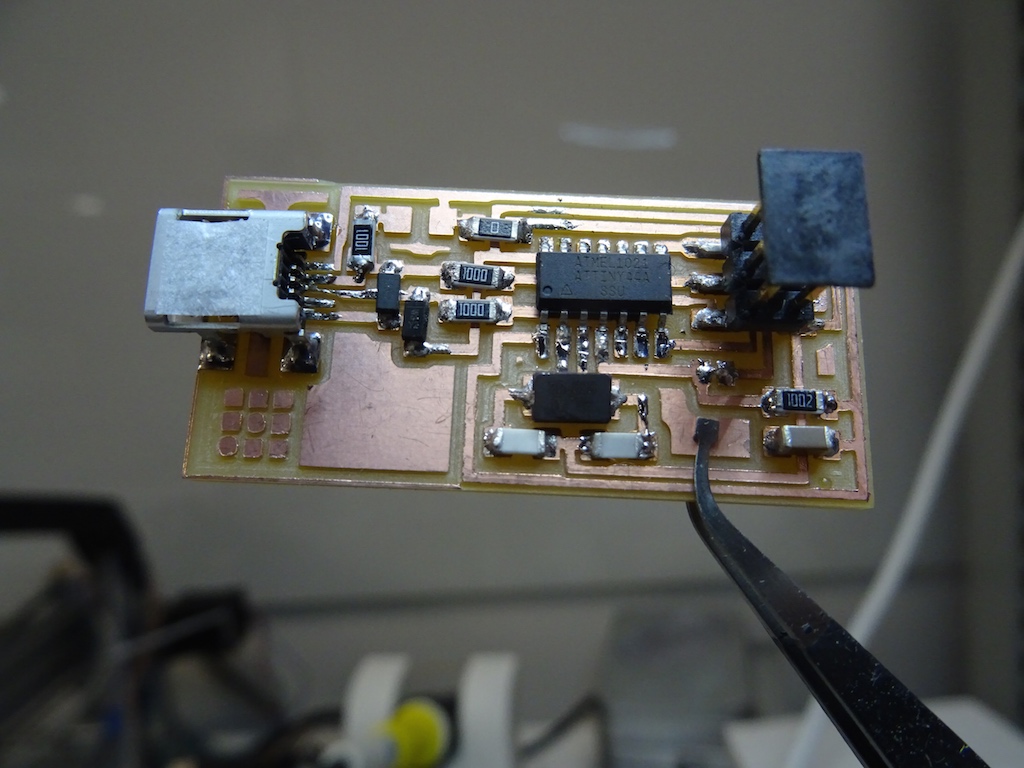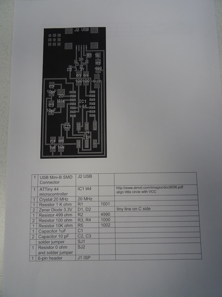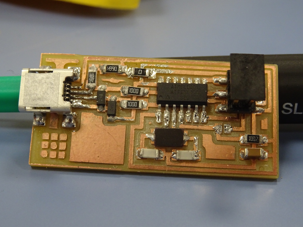 No success this time either. Niklas suggests there is either a problem in the USB mini header or the chip. But if it is a problem with the ATTiny44, he suggests just doing the whole board again - it will be faster than trying to remove the microcontroller and getting the solder off. Oh - just grrreat. We don't have any Tiny's left in the FabLab. I forget about it for a few days while working on the machine assignment. Then a guy from our university's ARTS electronics workshop wanders in and I ask him if he has any - he checks, but he doesn't. I email the guys from Electroshop in Design Factory and then I go and check their inventory but they don't have any either.
