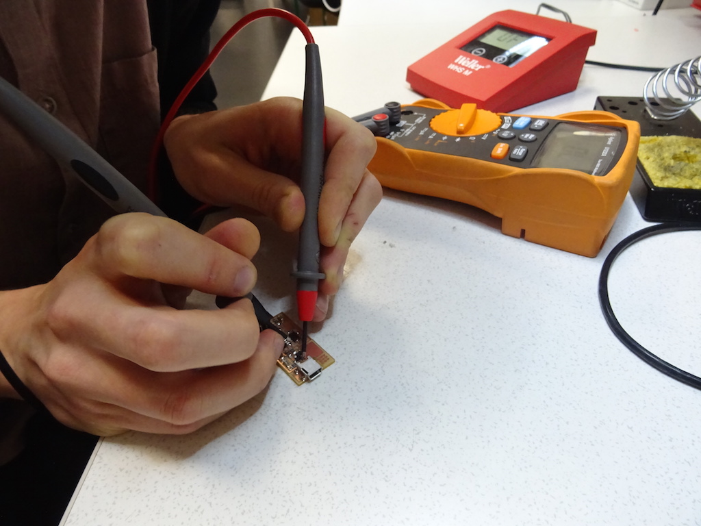 I identify the problem - it's at SJ2. I had misunderstood the instructions. I remove the resistor and solder and redo it. When I plug it into the computer I get no error messages. Niklas also checks the whole board with a multimeter to show me how to do it.
