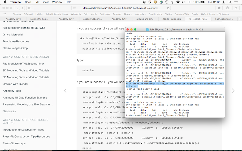 Niklas and I get a programmer and follow the tutorial for programming. I had downloaded and installed Crosspack AVR and XCode. It took some searching to find the right XCode for my ancient laptop running Yosemite (surprisingly), but I finally find this Wikipedia page. We follow the tutorial (downloading the firmware on the Desktop, changing the Makefile according to the instructions). At the 'make clean' command I had to agree to the XCode licence agreements. That was fine; the response was as it should be.