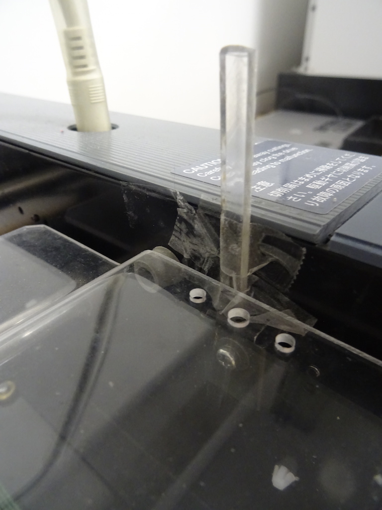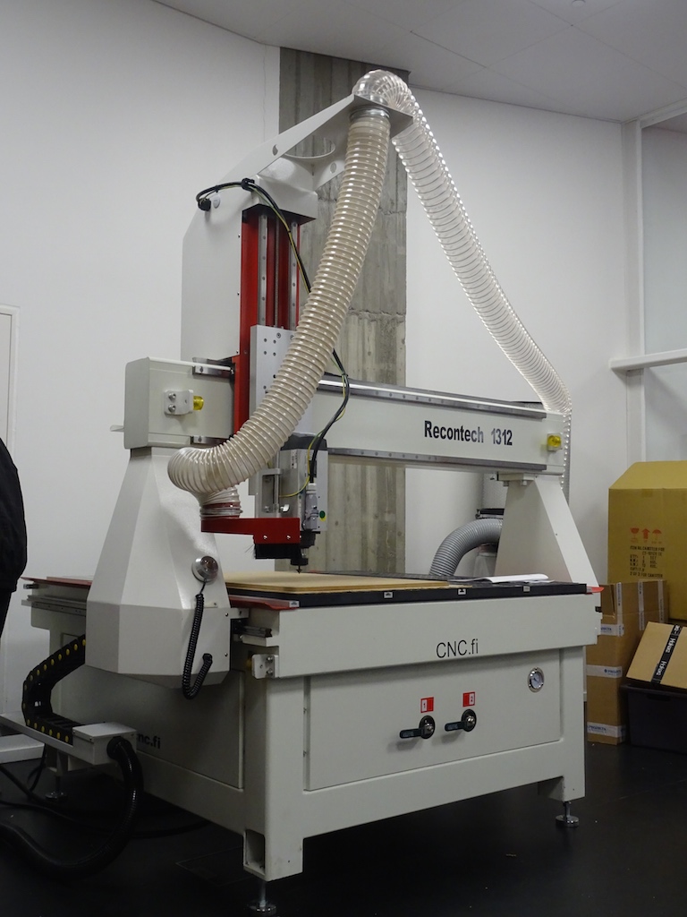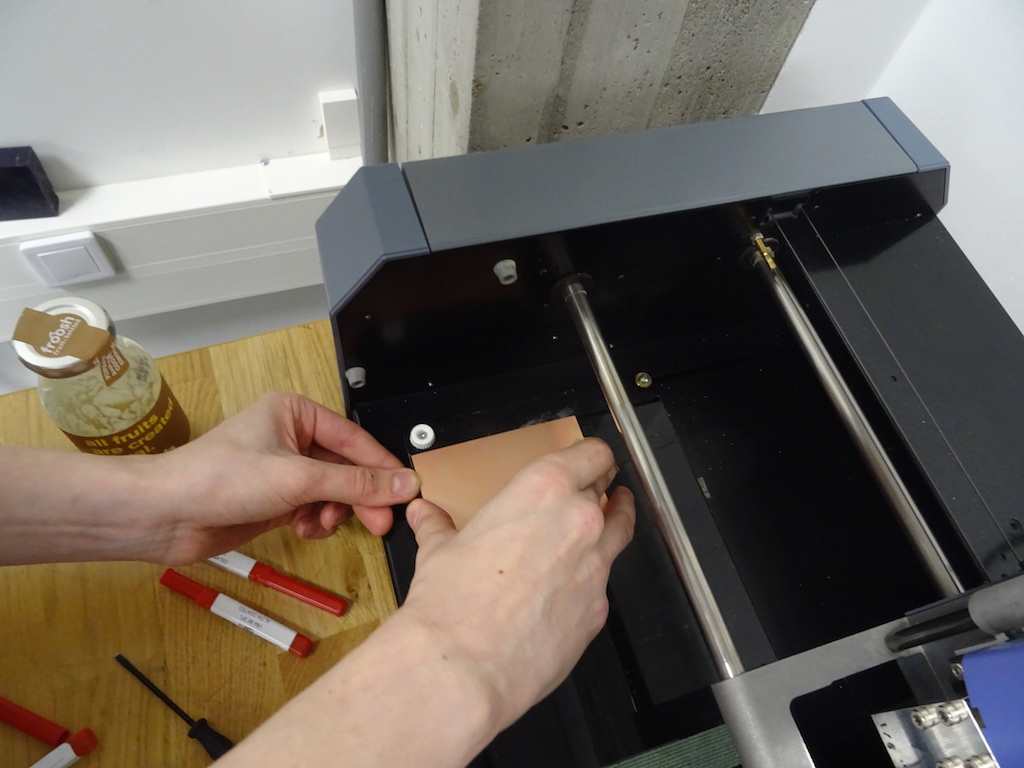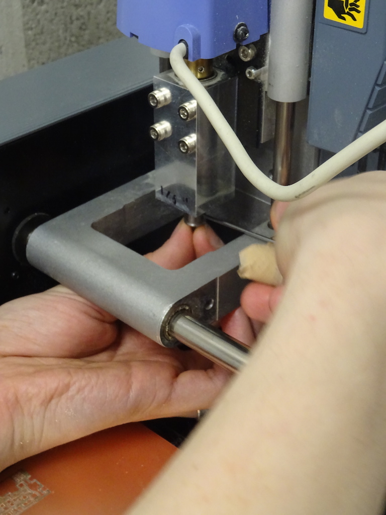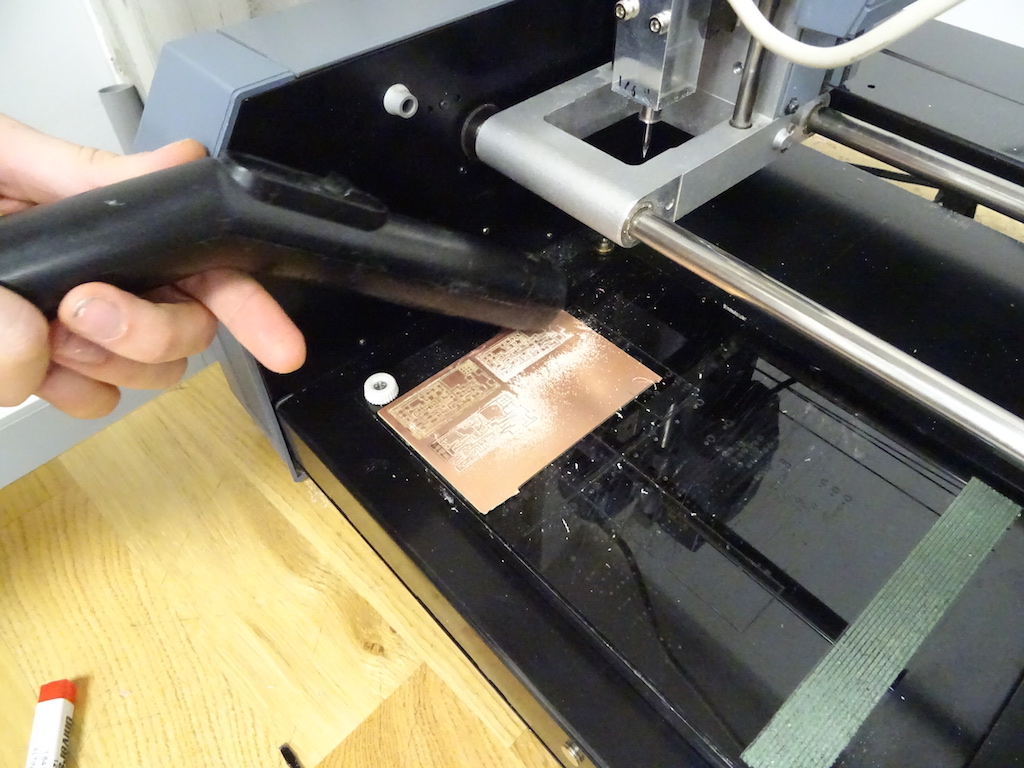 The second try, first by myself and then with the lab manager, we try and try again to mill another board. This time the problem is determining the z-position. The manager is not used to using Fab Modules and usually does this in the Windows environment. As yesterday, he also has to constantly leave to go and help other users. Finally I send the traces (cutting depth 0.15), hoover up the dust, change the end mill (to 1/32) and send the outline. I am very careful about getting the bit to the right position, tightening both screws and then getting the correct zero position. But at one point there is not a nice noise, and at the end the board is not cut through. The mill actually falls right out of the chunk (!) and it is broken.