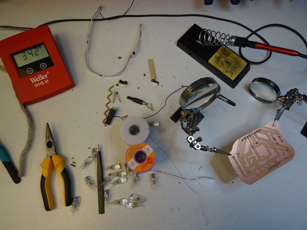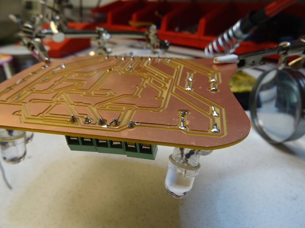 There is a dummy practice board that looks like previous Fab Academy students have been practicing on it. I take a few components and try to solder them on the surface. I have a lot of trouble with it. I try to hold the iron in one hand and the solder wire in the other, so I can't hold the component down with tweezers at the same time. I get one end done and when I pull the iron away, it causes the other end of the resistor to stick up. As I'm moaning and moaning about the difficulty, Jason arrives and says he would have a job I could do for him, something he had brought to do here, where the parts are bigger. It's a circuit he's made for his Showerloop project that has LED lights coming through holes. All I need to do is line up the lights according to the diodes, stick the wires through the hole and solder the point. He watches me do a few and points out both how the solder starts to flow and how it looks shiny afterwards when it's a good solder joint. Then he goes off to the other room where the guys are getting training for the new CNC milling machine.