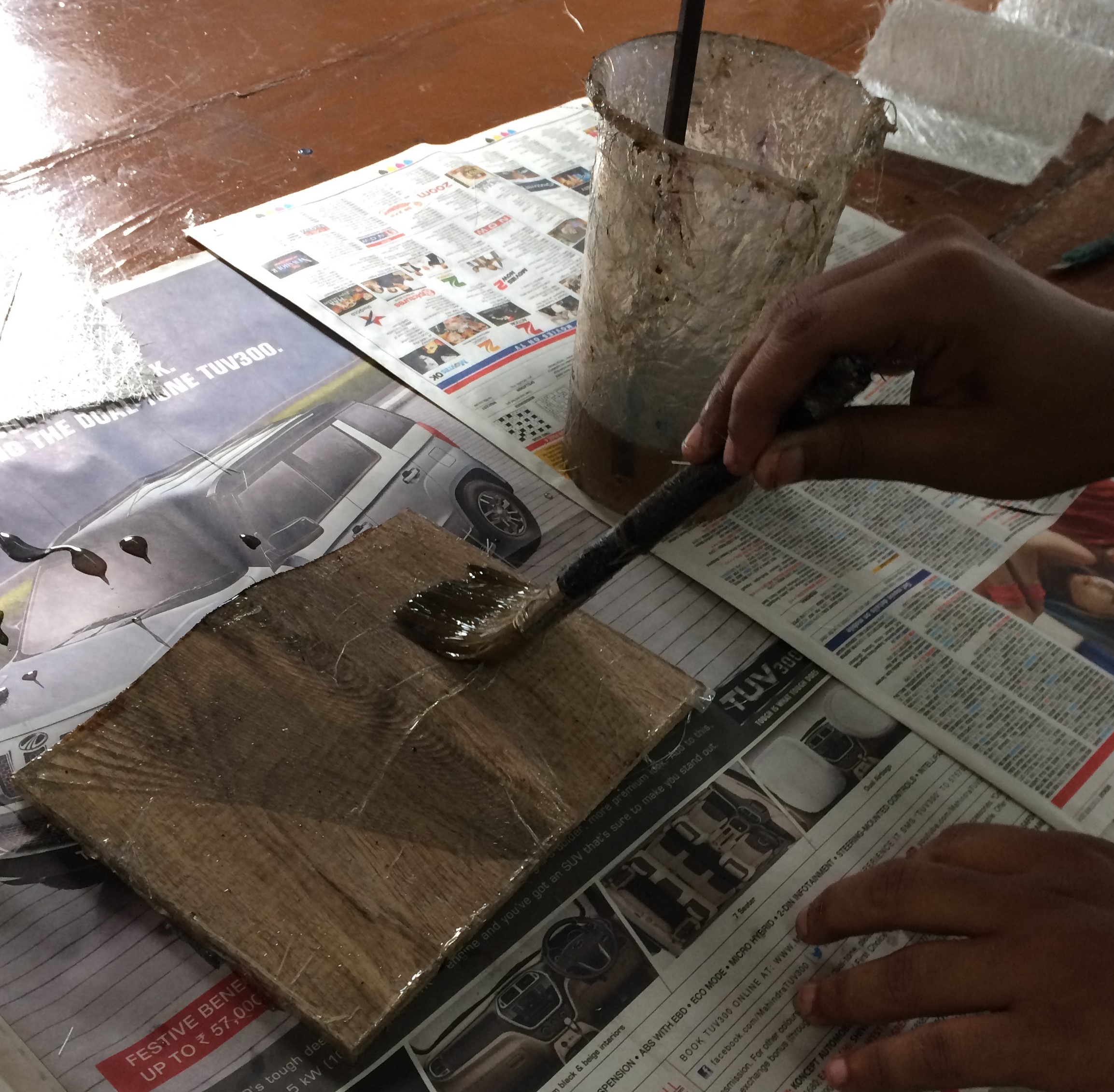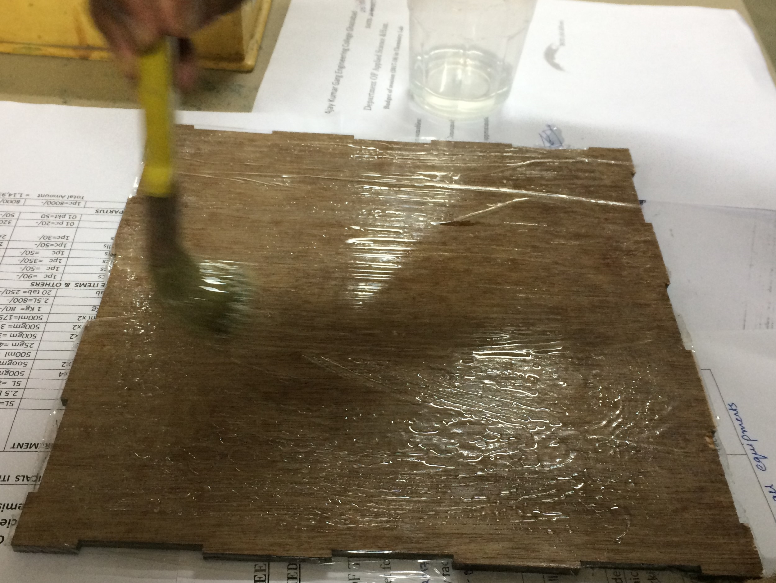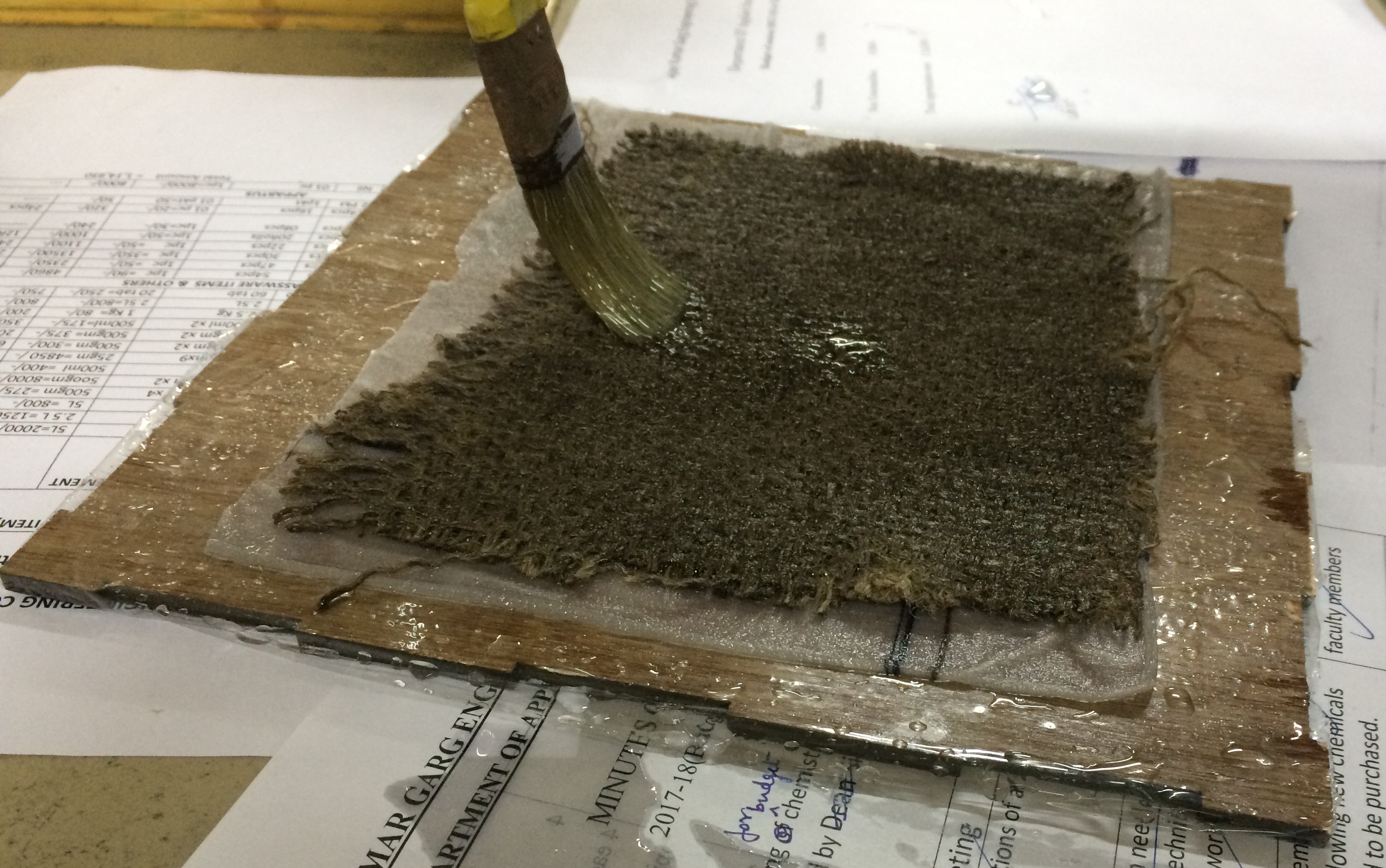 After creating the mixture, First a layer of glass fiber is put and prepared mixture is pasted over it. This process can be repeated after putting the next layer of the flass fibre. I created 2 layer composite.