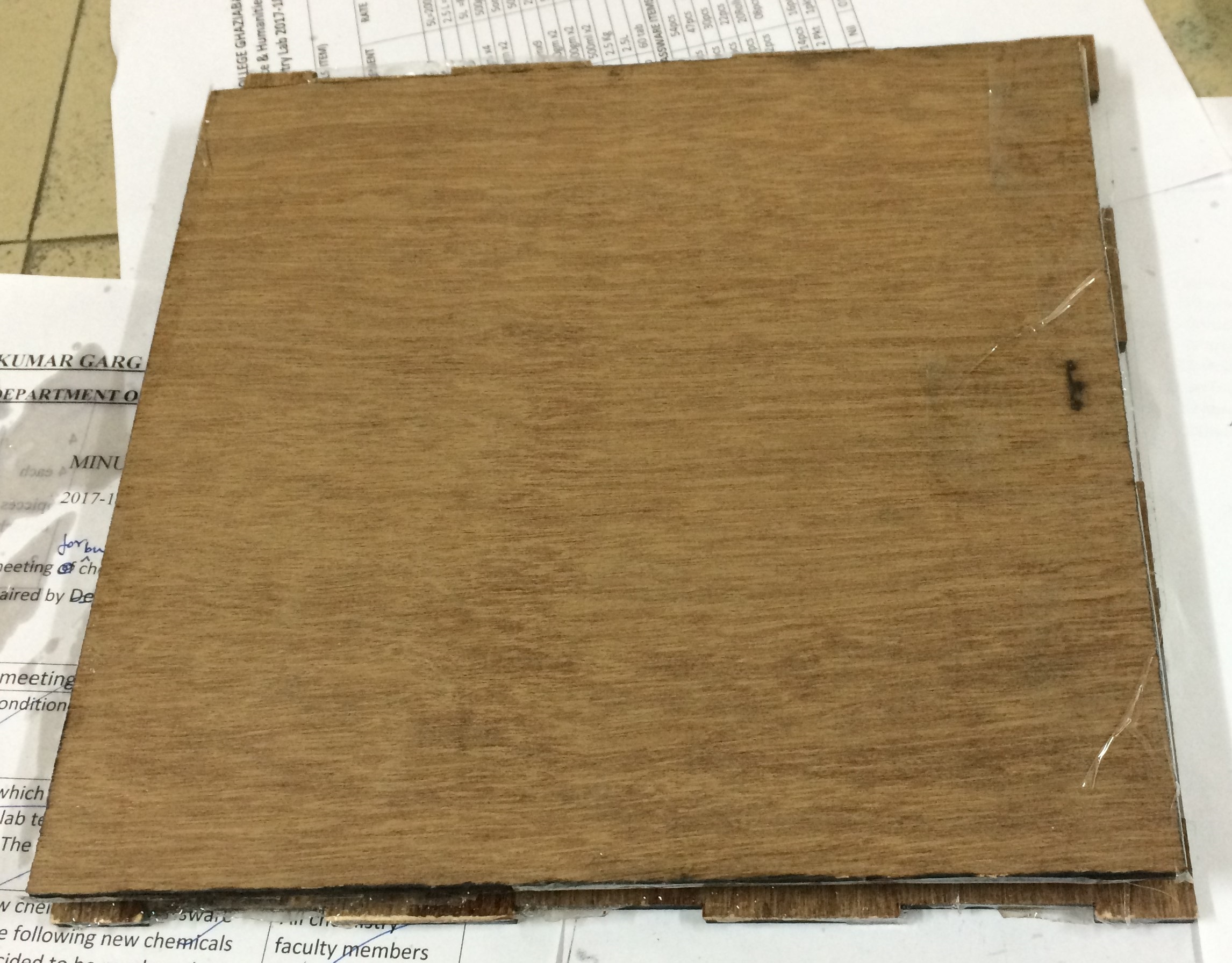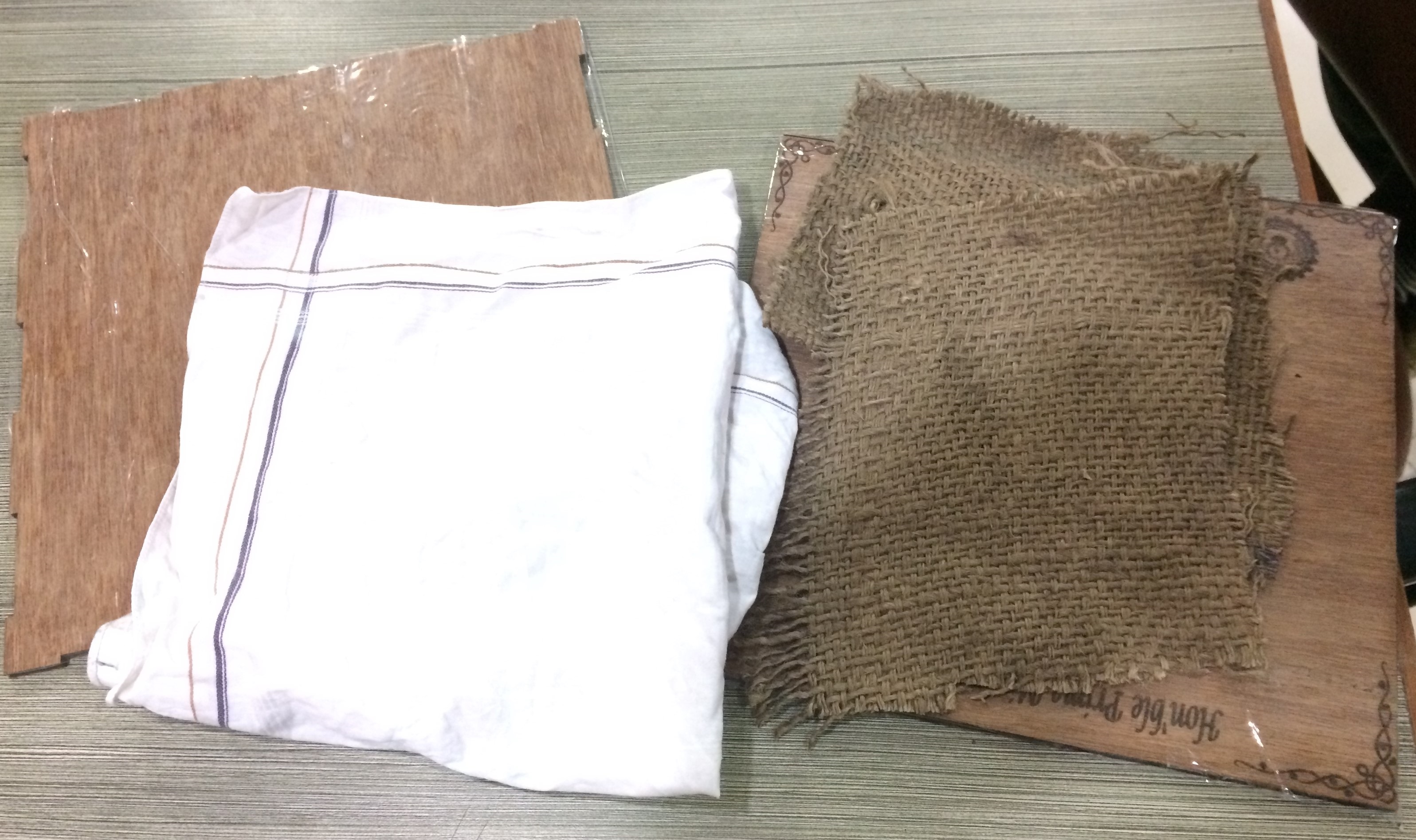 1. Initially I arranged two pieces of jute and cotton cloth of dimension 15x15 cms and two plyboard of 23X23 cms.