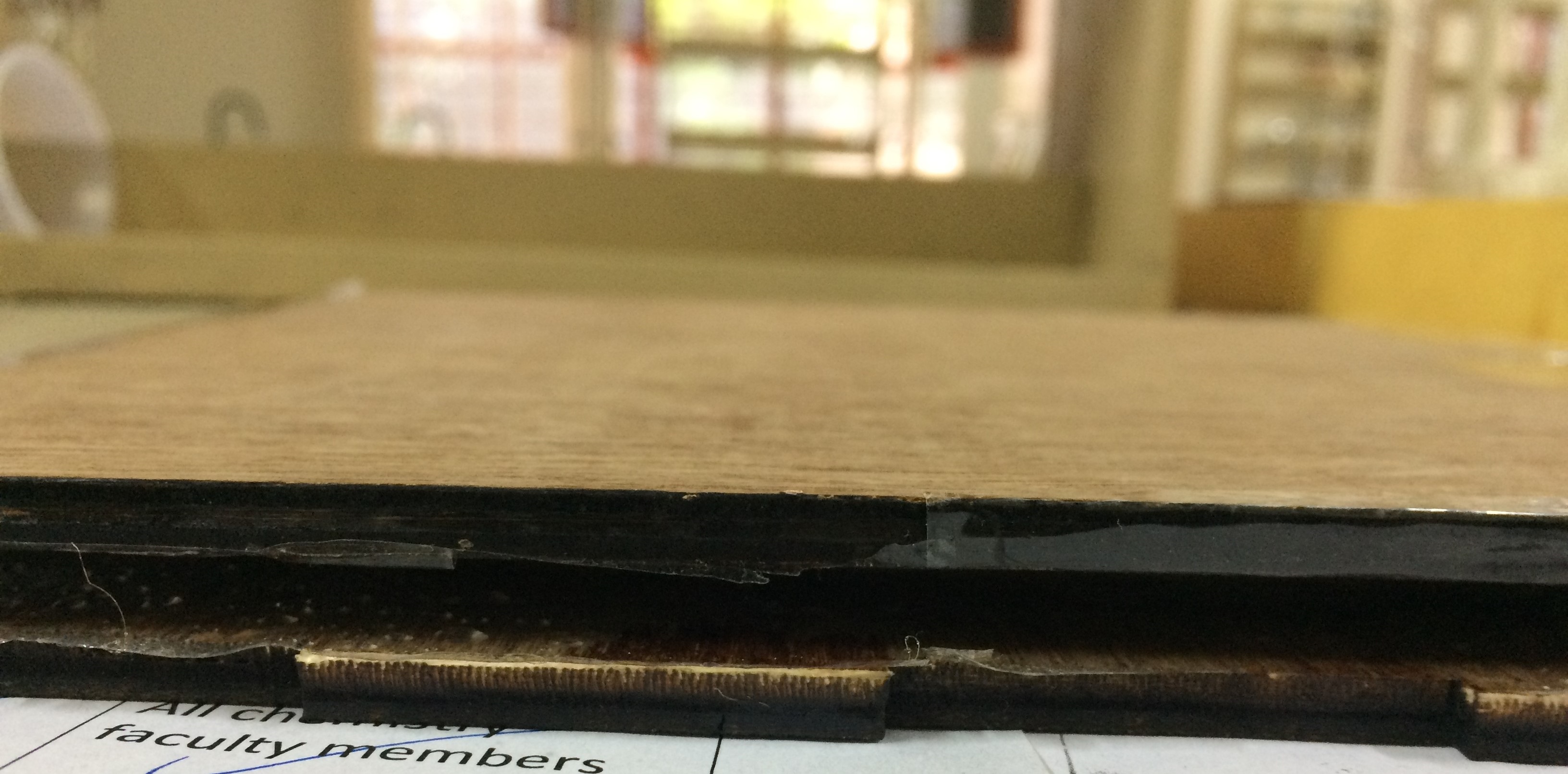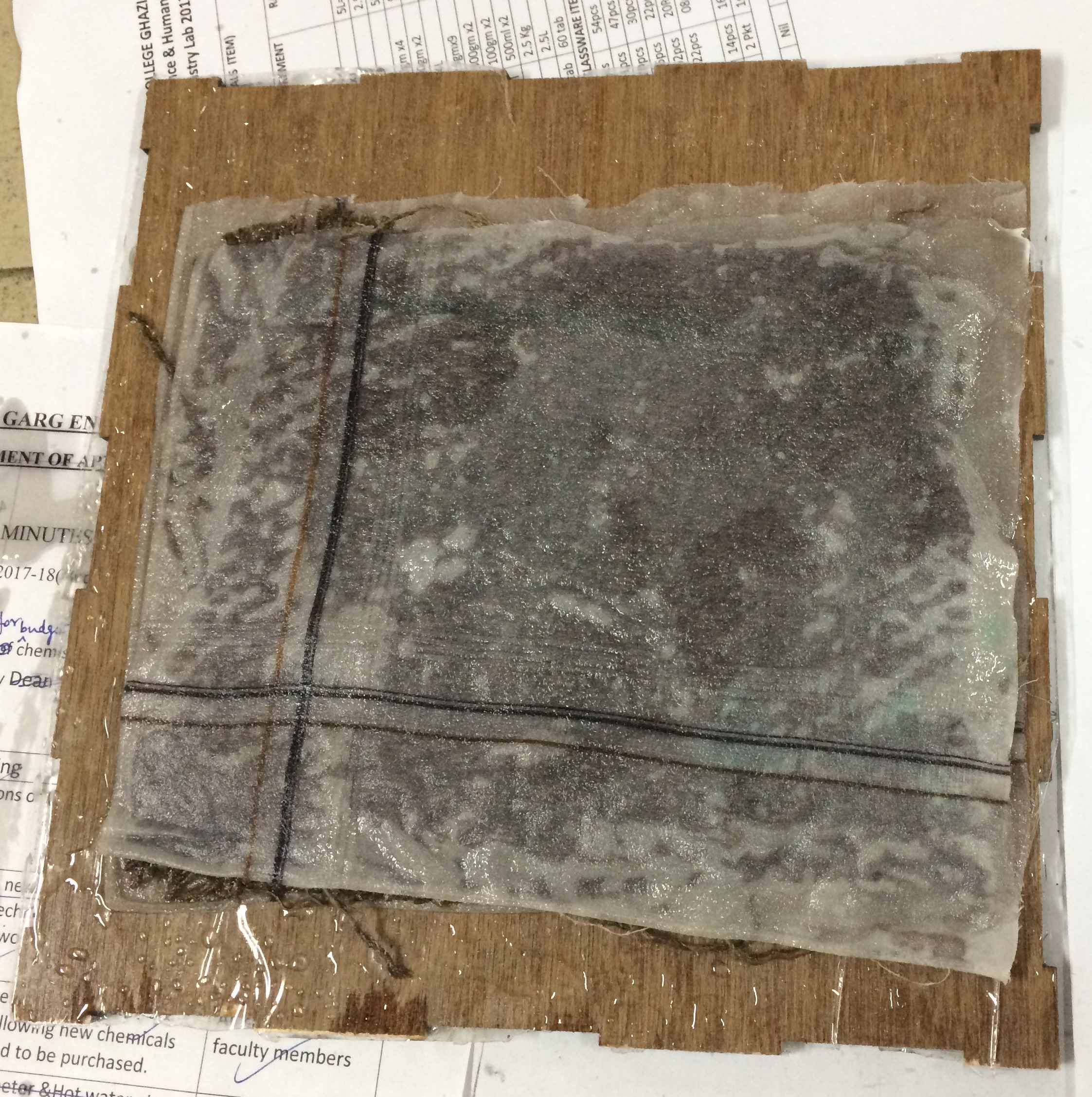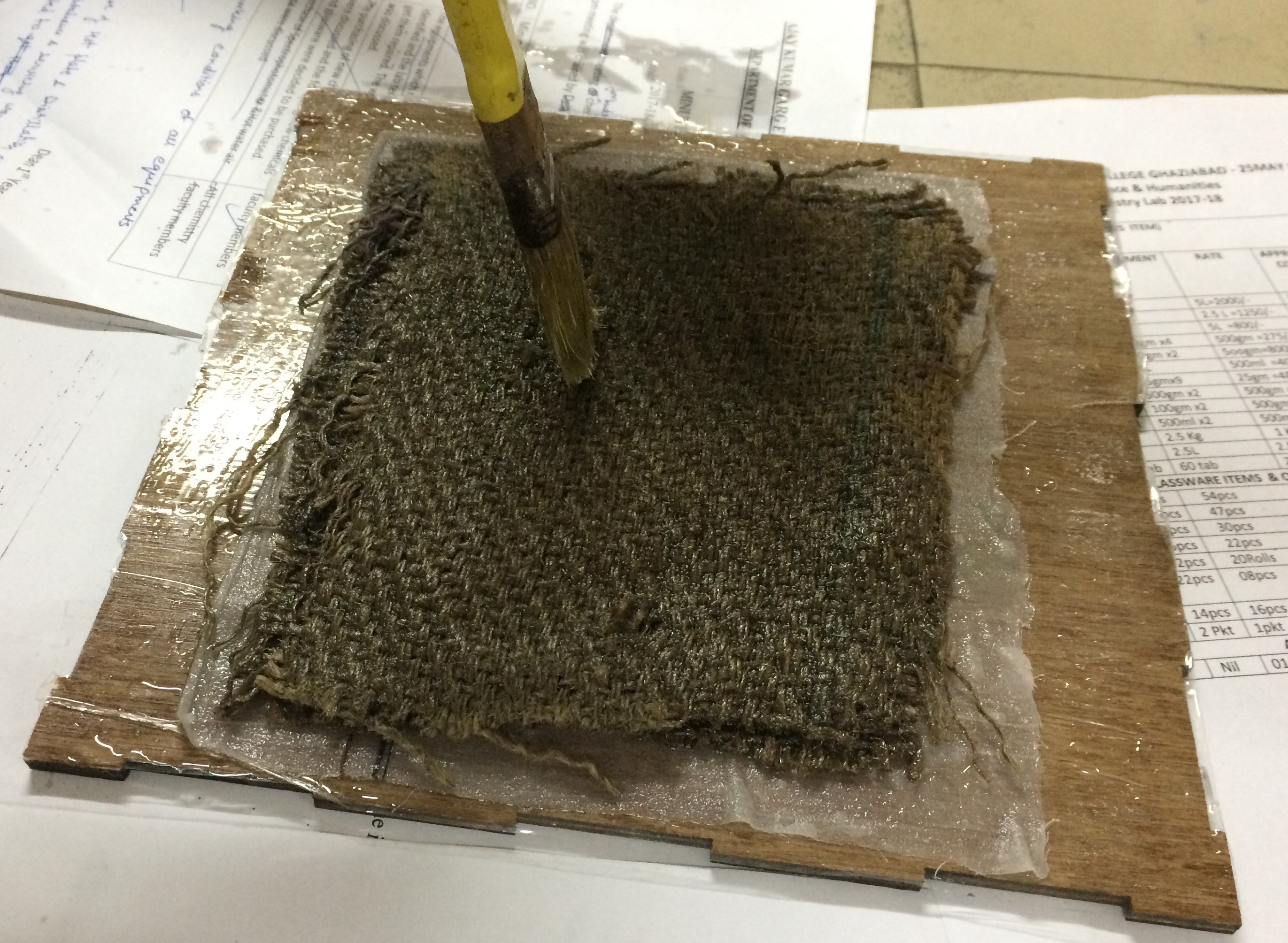 3. A layer of mixed resins is layed on the plyboard and then layers of cotton and jute pieces are put on it after soaking it properly into the resin, as shown below. Afterwards on top the other plyboard it put and pushed a bit to squeeze the extra resin out.