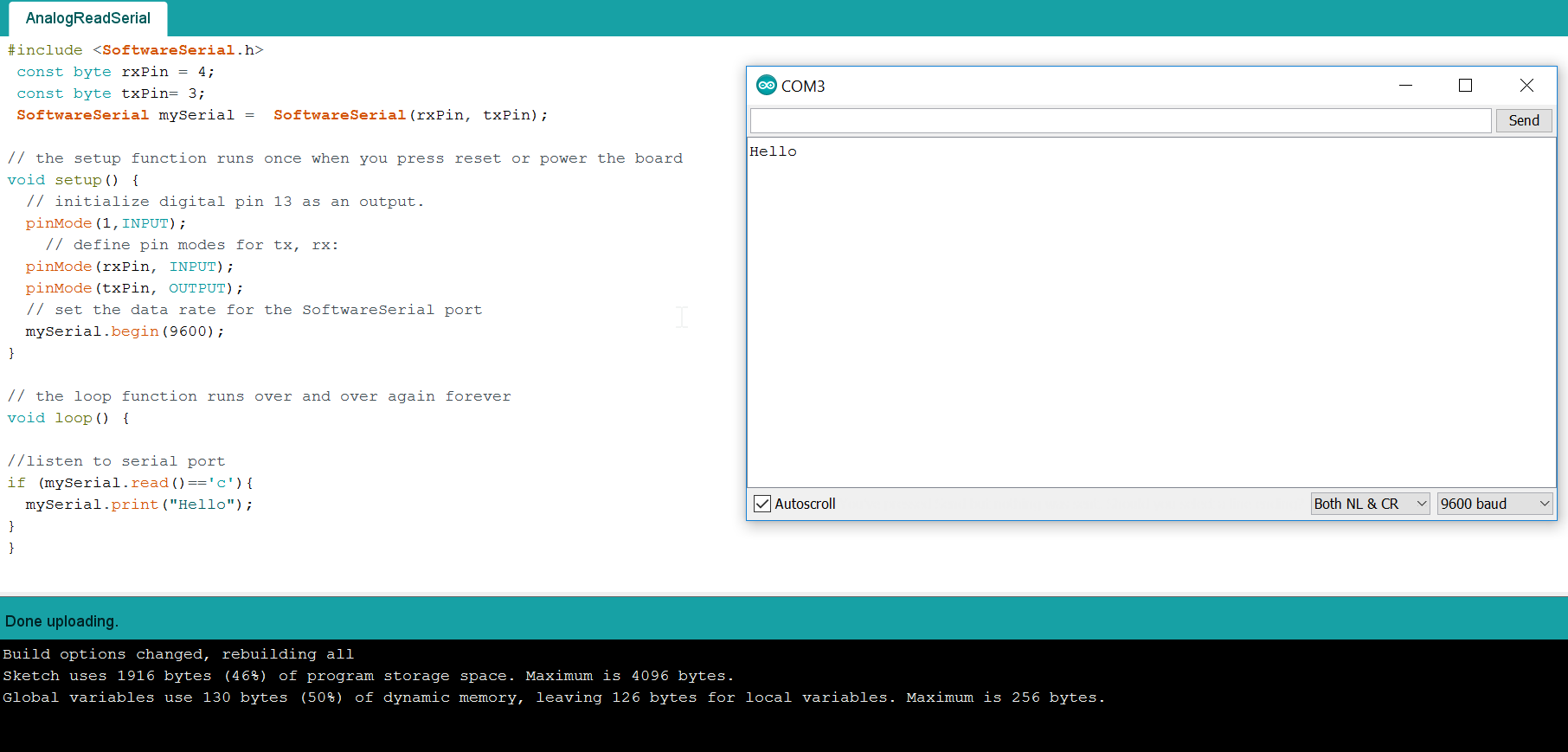 To check the serial communication with the board, I wrote one program to display "Hello" on serial monitor when c is given as input.
