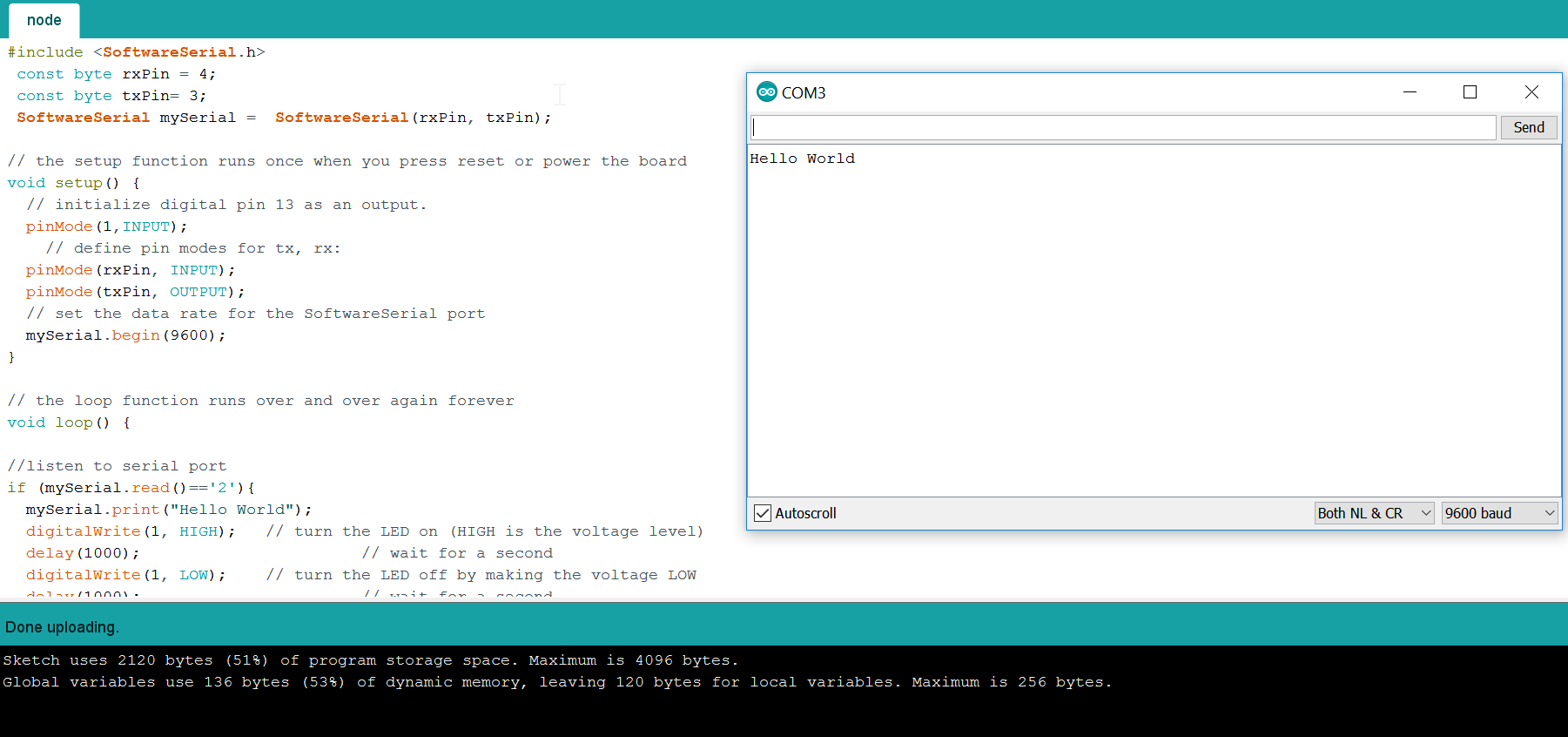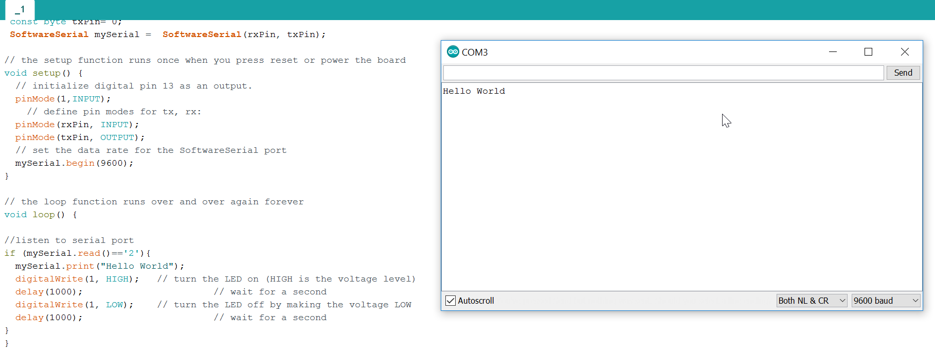 To check the serial communication with the board, I wrote on program to display "Hello World" on serial monitor when 2 is given as input.