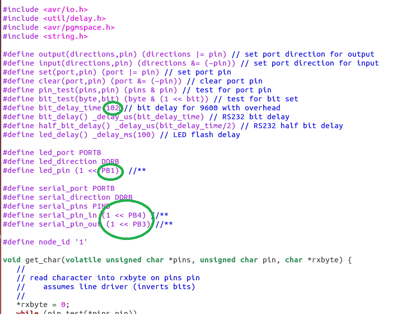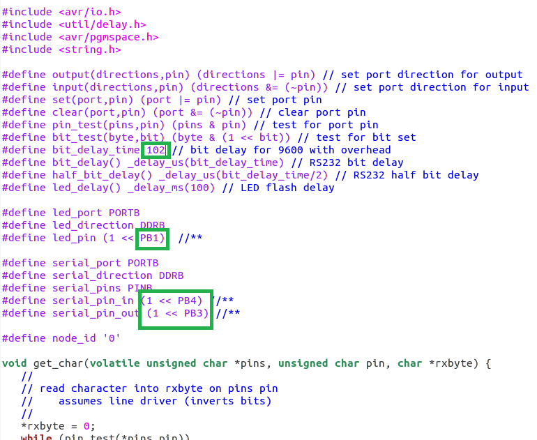 Rx, Tx & input to led was defined in the program in the form of corresponding pins. Also, bit delay time was increased from 100 to 102, to have proper display on the serial monitor. All the required manipulations done with the Neil's C code is shown below.