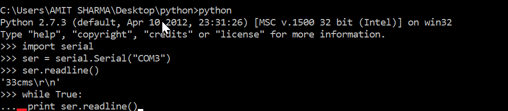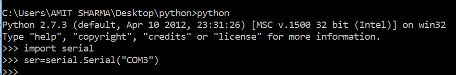 - To check the serial communication of the board just type "ser=serial.Serial("COM3")". Where COM3 defines the communication port, if it's communicating we will get a error message. In my case it was working fine.